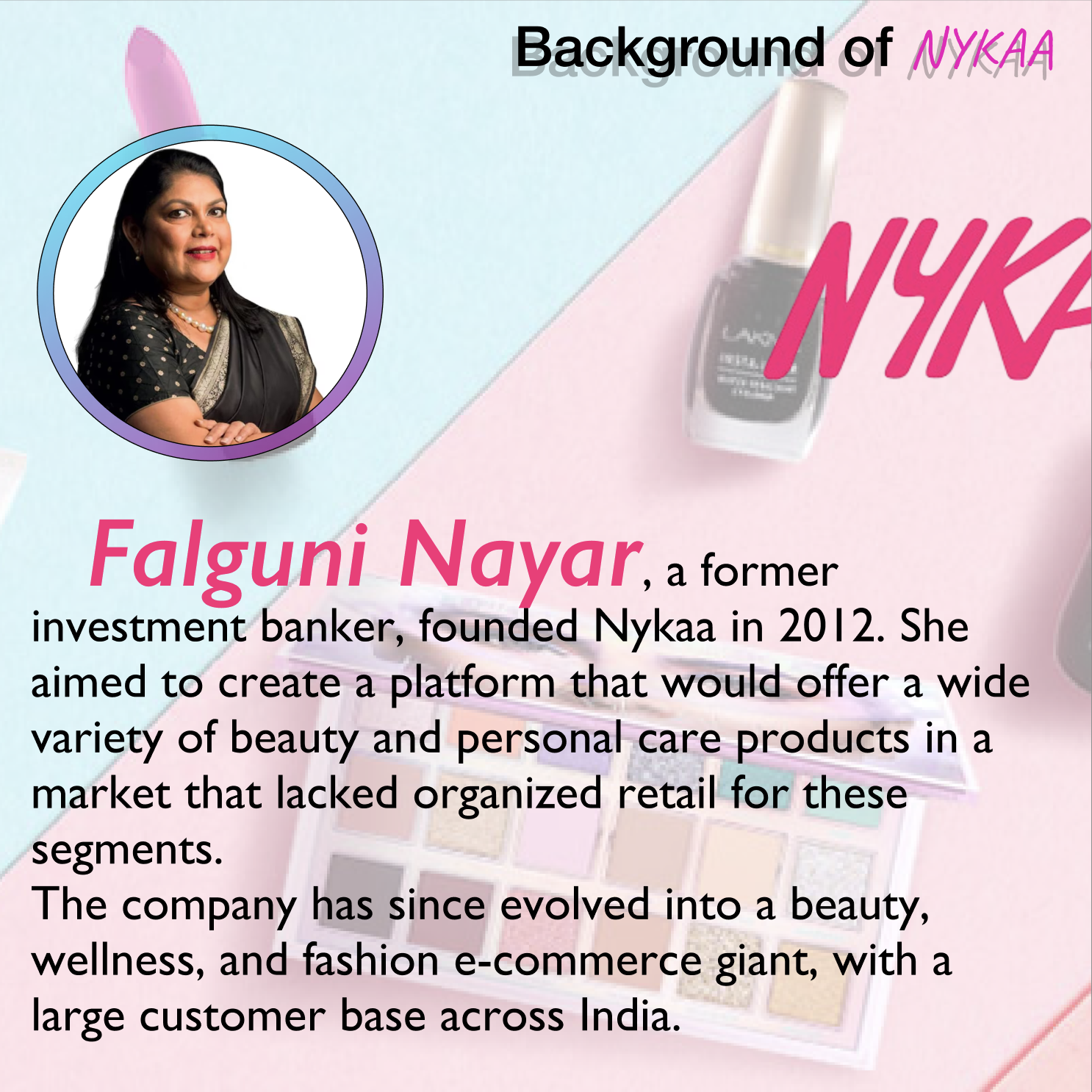 Day - 1 Startup case study: Nykaa Founders : Falguni Nayar Total Funding: $124 Million Key Investors: TPG Growth, Lighthouse India, Steadview Capital Nykaa is India's Leading omnichannel beauty & personal care retailer founded by former investmen