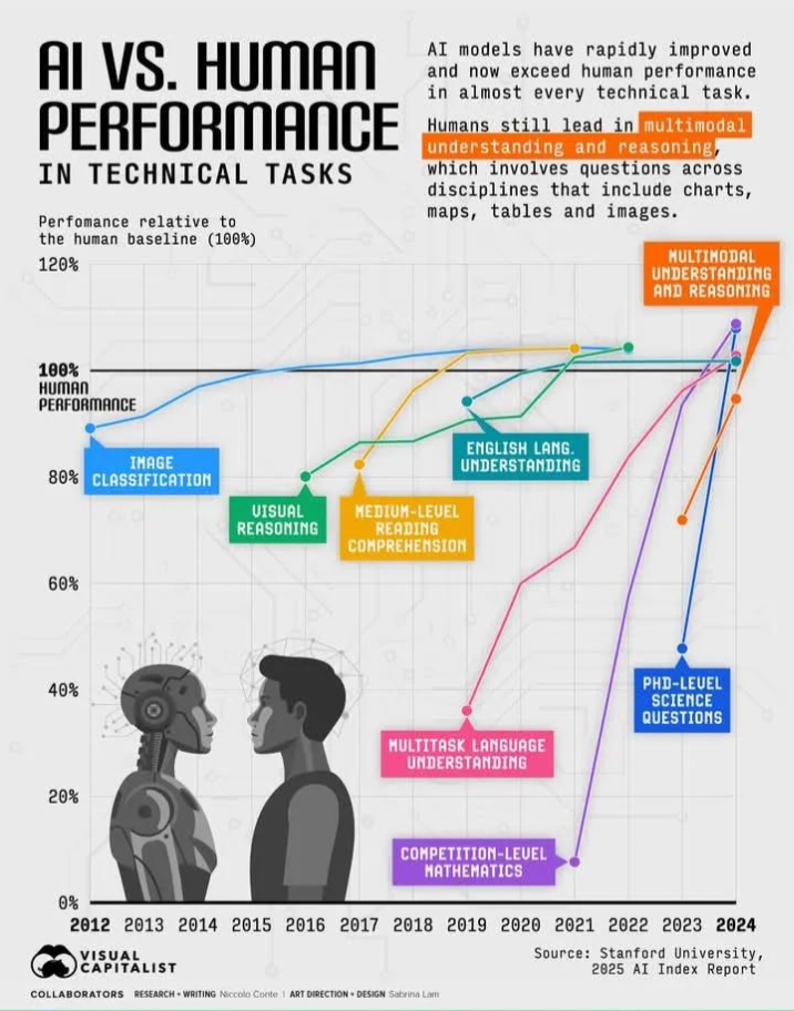 AI is no longer just catching up — in many areas, it’s already ahead. According to the 2025 AI Index report, models now outperform humans in most technical tasks. From image classification to visual reasoning — machines are setting the pace. In j