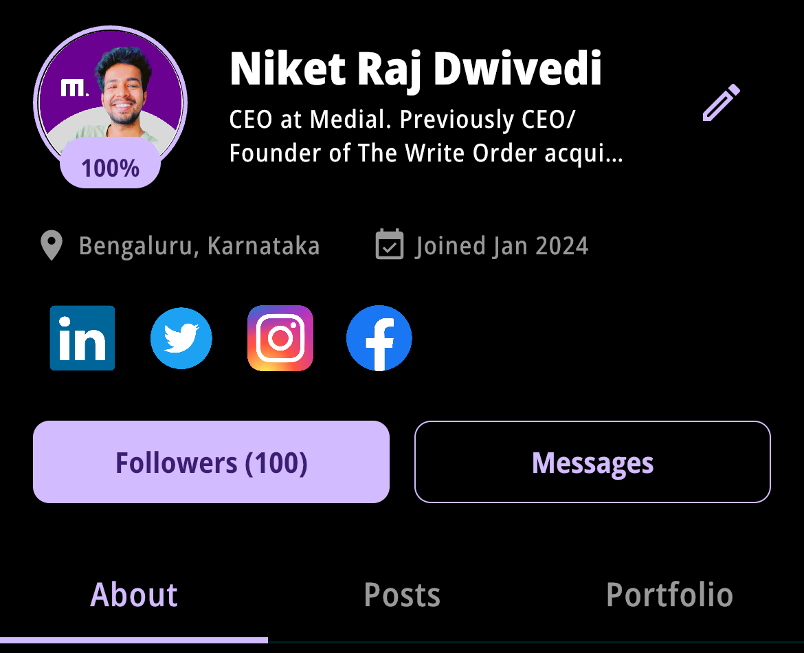 I crossed 100 followers on Medial today! Thanks for showering you love on Medial. Iโm proud of how our community is shaping up and would like to thank each one of you โค๏ธ๐ The first person to reach 100 followers (who isnโt a Medial team member) will