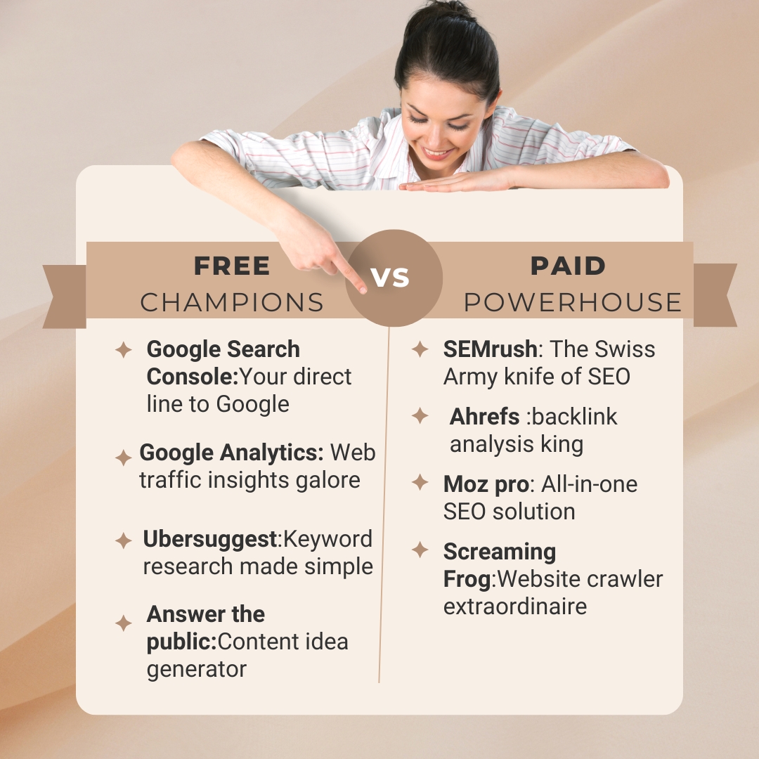 SEO Tools: 4 Free vs. Paid Options for Businesses Ever feel like a digital David facing the Goliath of SEO? ๐๏ธโโ๏ธ You're not alone! Let's talk tools - your slingshot in this battle. Here's my take on 8 popular SEO tools, both free and paid: ๐ Fr