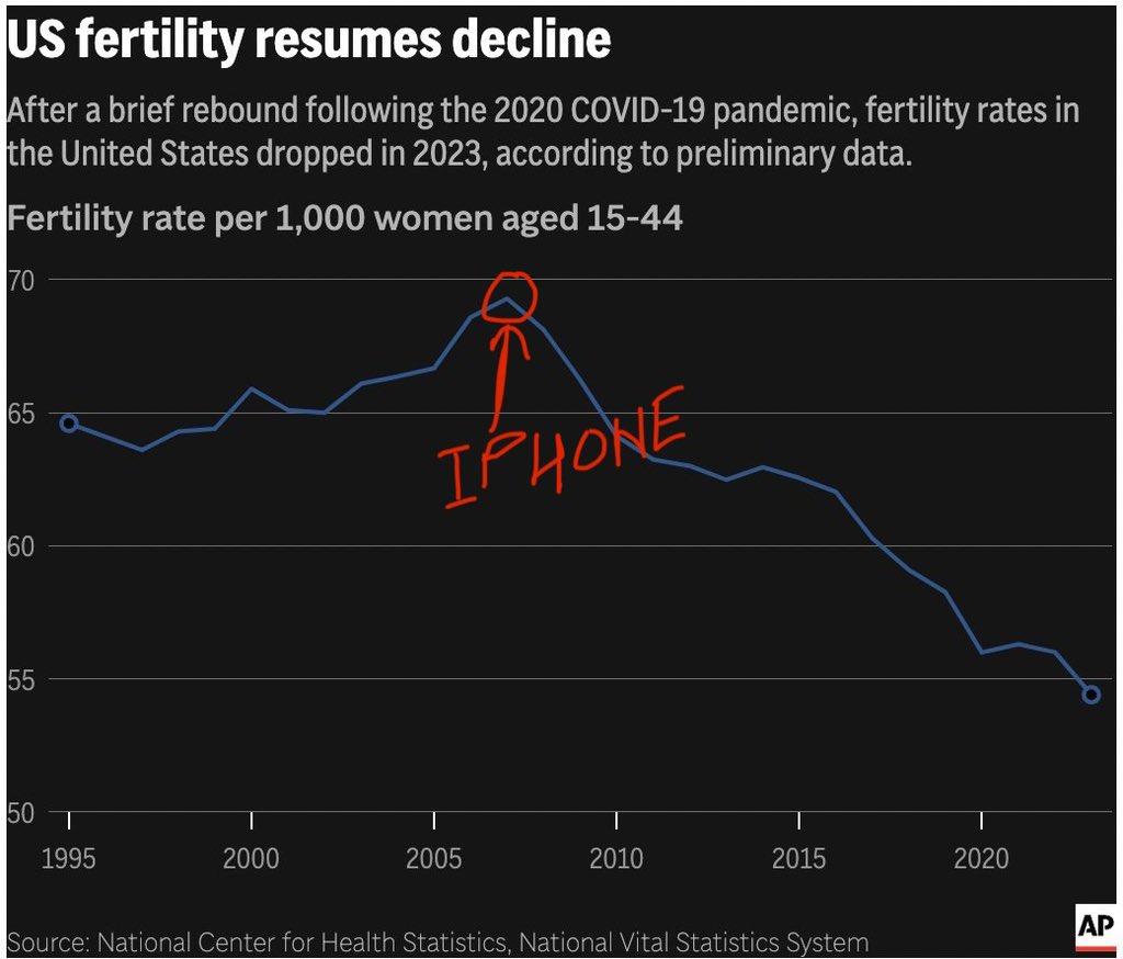 One could argue that the invention of the iPhone led to the decline of fertility rate in the US.