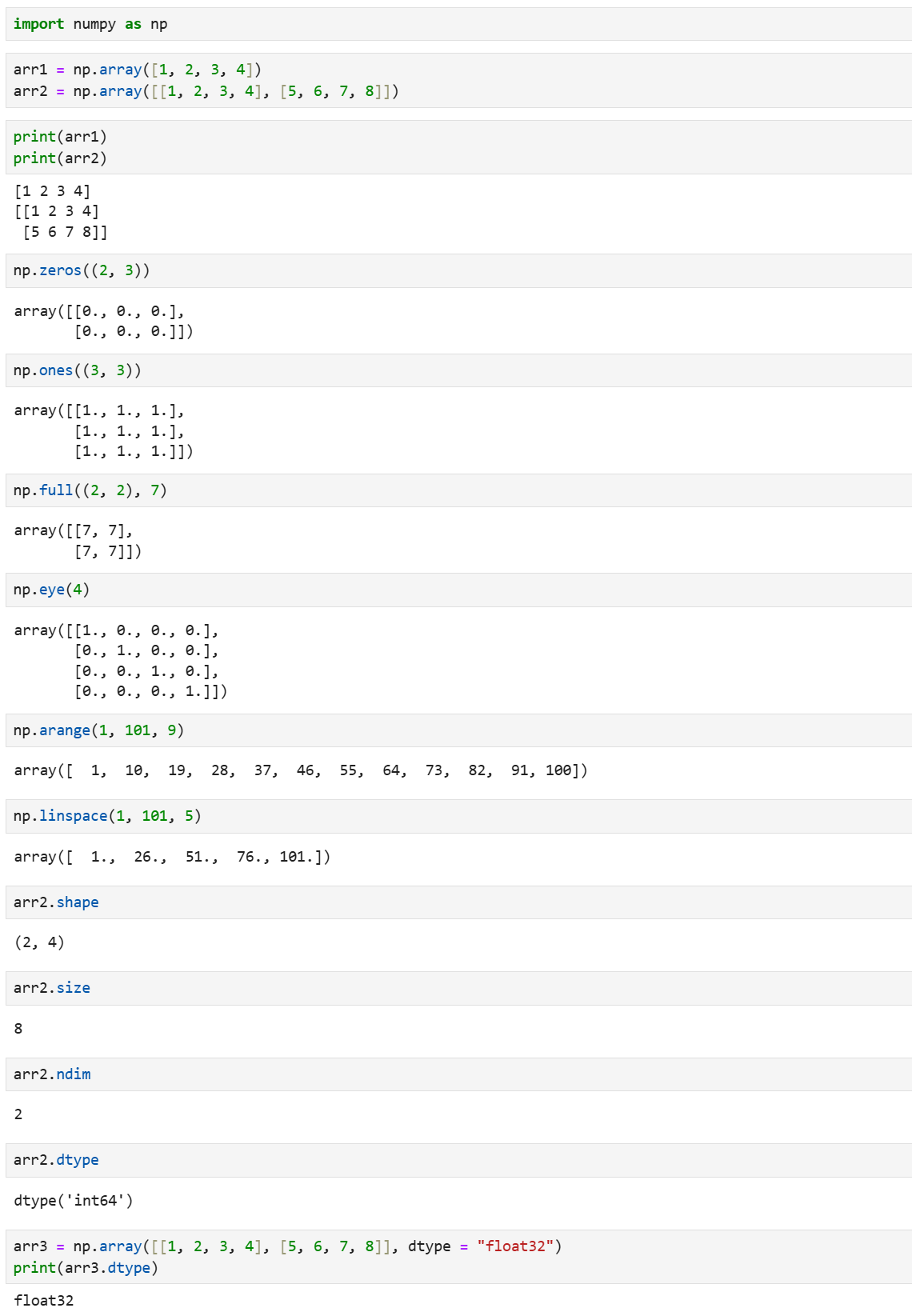 Day 6 of learning Data Science as a beginner. Topic: creating NumPy arrays NumPy arrays can be created using various ways one of them is using python list and converting it into a numpy array however this is a long way here you first create a pytho
