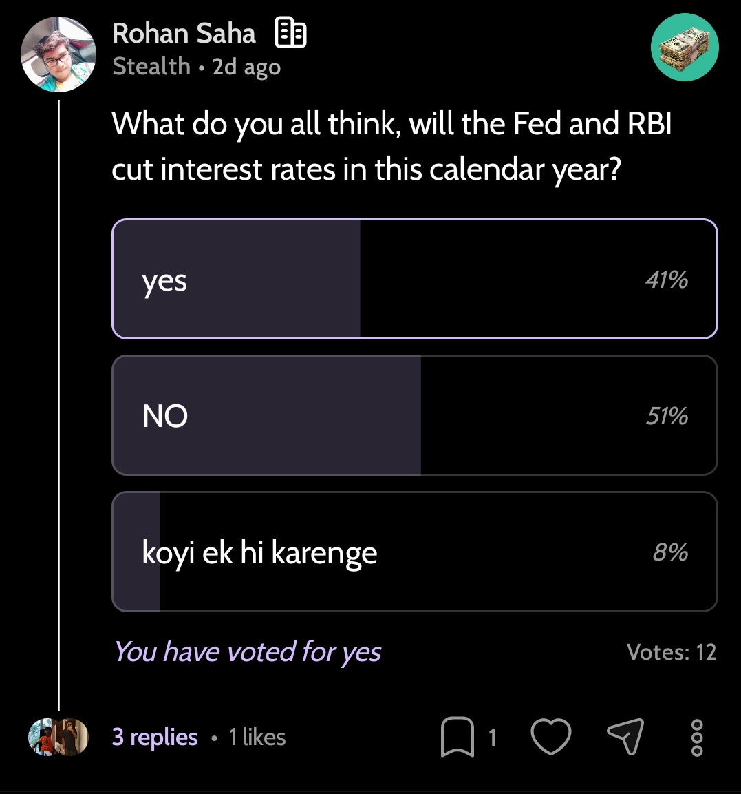 In the poll I conducted yesterday, 51% of people were saying no, but the Fed has cut rates now. Only the RBI is left; let's see what happens.