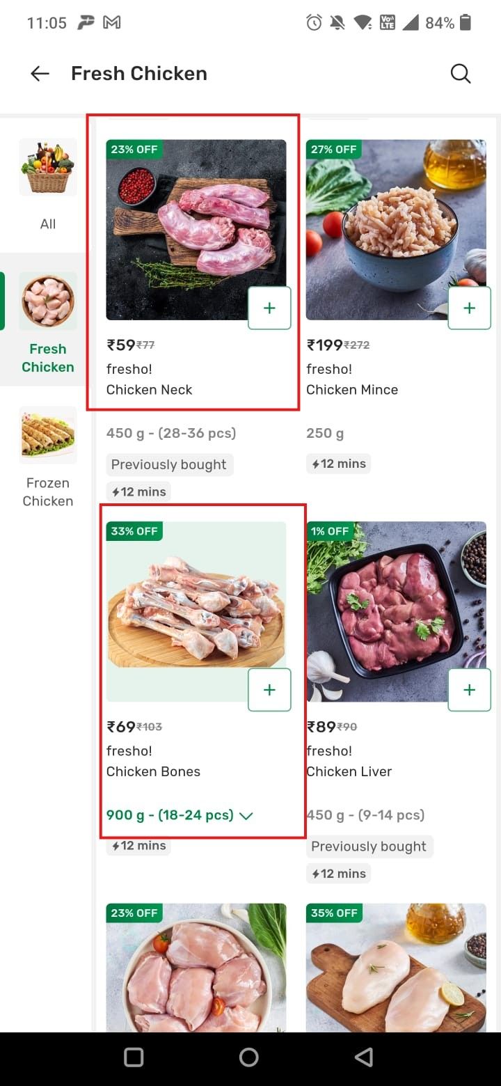 Lately, I see a lot of praise for Blinkit for their rapid assortment addition, but here’s a reason I repeat at Bigbasket, every week. Fresh dog food niche. Bigbasket’s meat category, they have sku’s curated for dogs. You get necks at ₹59 and chicke