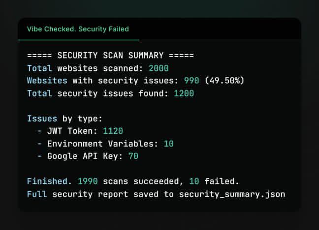 Somebody just scanned 2000 Vibecoded websites... and here's what he found : - 49.5% had security issues - Found 1120 JWT tokens exposed - 70 Google API keys floating around And yes, env vars in production ๐คฆโโ๏ธ Security ain't a vibe if you're lea