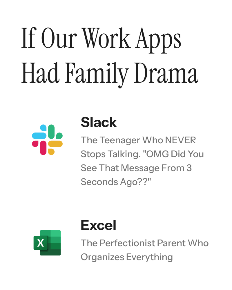 If our work Apps had a Family Drama (This comes from my funny observation about our work apps): 👻 Slack: The teenager who NEVER stops talking. "OMG did you see that message from 3 seconds ago??" 📊 Excel: The perfectionist parent who organizes ev