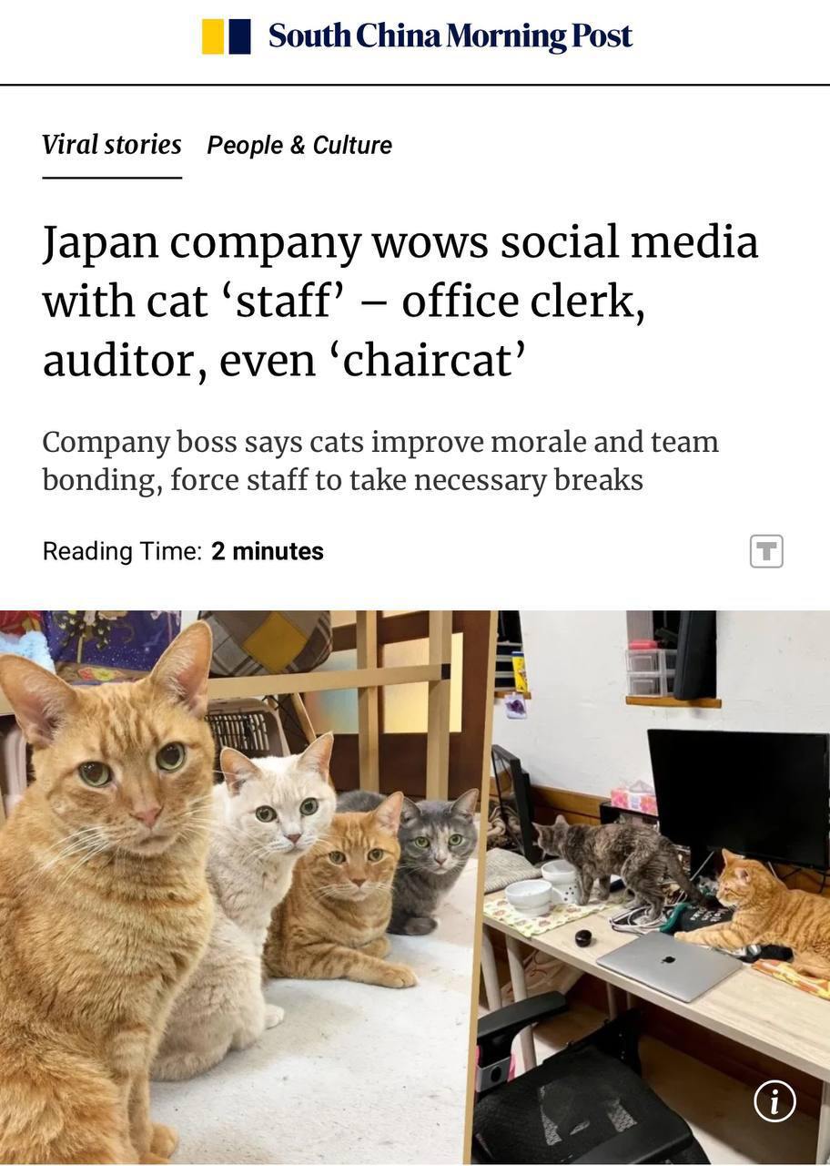 🗣A Japanese company hired 10 cats 🐱 to save employees from burnout. Employees were more than happy to return to the office. After all, it's nice to have such furry friends waiting for you at work! The experiment was a success. 🐾😊