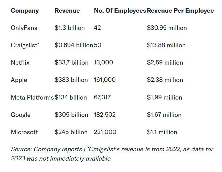 OnlyFans has far outpaced the largest corporations on the planet in earnings per employee. ๐ธ๐ On average, each worker on the platform generates $31 million. In comparison, Google and Microsoft each make just over a million dollars per employee. ๐ป๐ฐ As has been the case for thousands of years, the most lucrative professions are tied to indulgence and sensuality. ๐ฒ๐