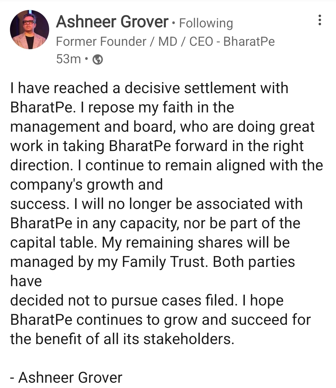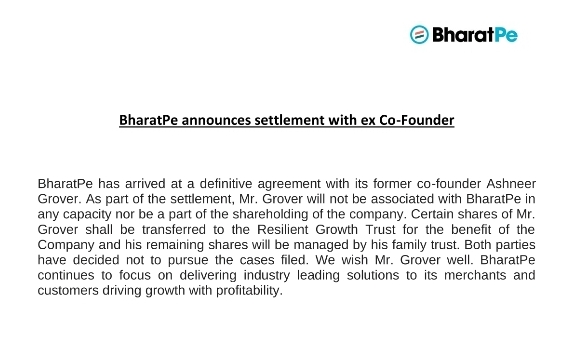 Bhartpe have officially announced settlement with Ashnner Grover. The filed cases between them would not be pursued anymore.