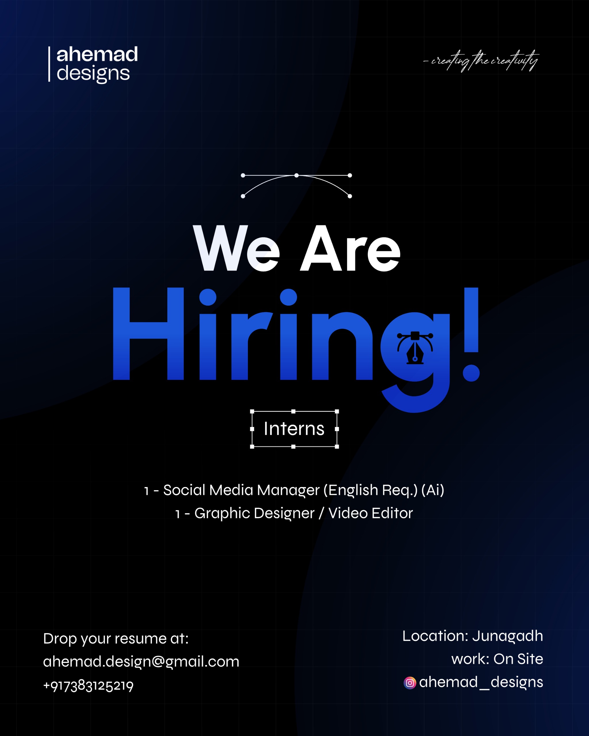 ๐ Weโre Hiring: Social Media Marketing Intern ๐ Location: On-Site | Junagadh, Gujarat Are you passionate about social media and creativity? Do you want to kickstart your career in digital marketing? This is your chance to join Ahemad Designs as a