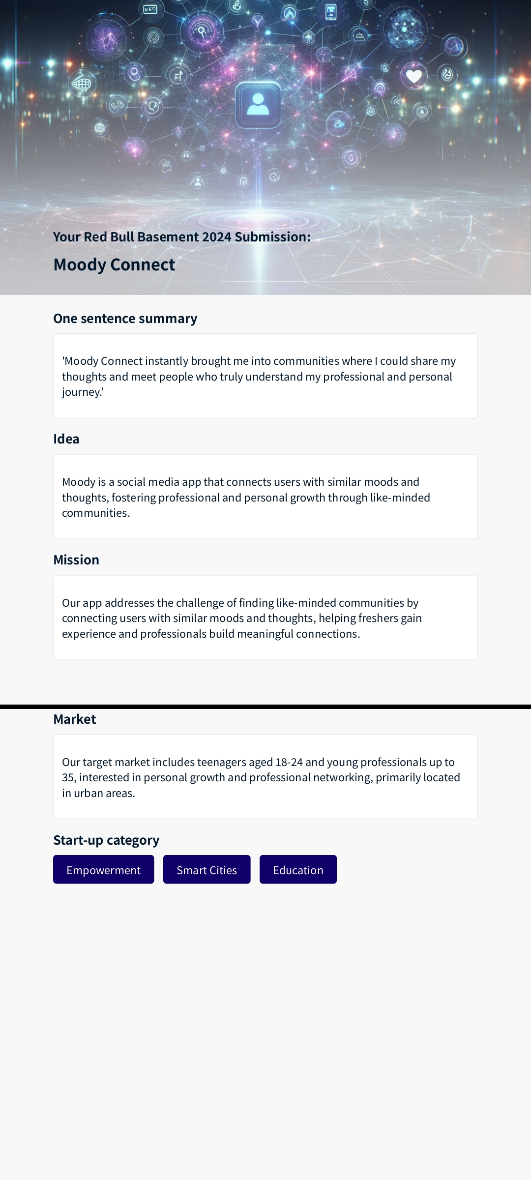 My submission of a Moody at the Red bull Basement 2024 Introducing Moody:Your New Way Mood based networking app social media app (Moody) To share daytoday mood/thinking and connect the New friends like same mood/thinkers and build the best people of community the professional people connect with same mindset share thinking to there professional community we add the ai to suggest the people for similar thinker and ai was track by see ur today post (today post is a post where u share ur mood only for a day) and this was easy to connect the professional people and talk directly and repeatedly build a great community of friends and grow the network. • Linking Moods, Building Communities and focusing the help fresher to become experienced by joining the professional people community. IDEA - https://medial.app/idea/moody-app-2339e898b21d3 linkedin - https://www.linkedin.com/in/vinay-goswami-672265255?utm_source=share&utm_campaign=share_via&utm_content=profile&utm_medium=android_app