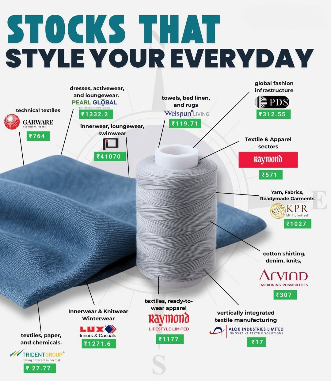 Explore the fashion powerhouses behind the clothes you wear every day 👇 🧵 Top Textile Stocks in India: Page Industries – ₹41070 Pearl Global – ₹1332.2 Lux Industries – ₹1271.6 Raymond Lifestyle – ₹1177 KPR Mill – ₹1027 Garware Technical Fibres – ₹