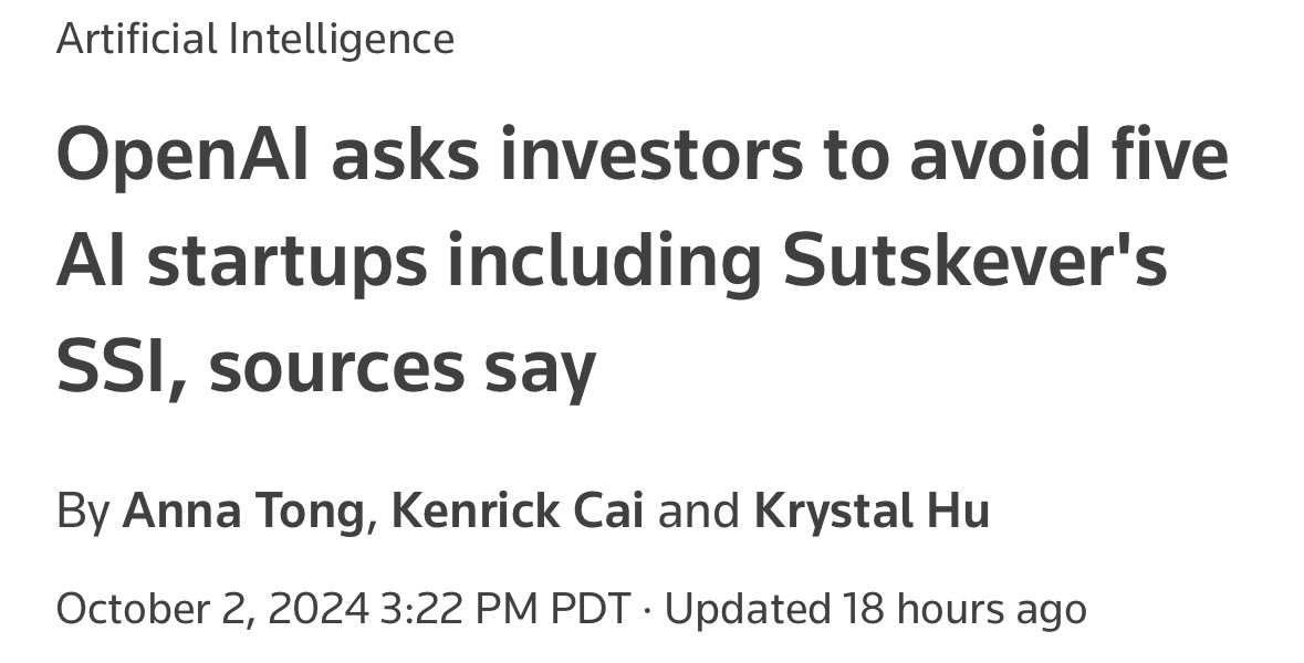 The five startups OpenAI doesn't want their investors to fund are: Anthropic xAI SSI (Ilya's company) Perplexity Glean