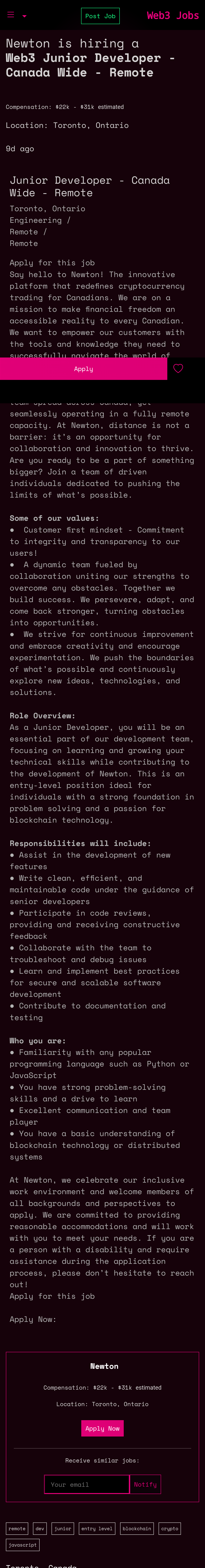 Internship for remote work for a Canada based company Web 3 Entry Level Jobs ( Devs) https://web3.career/junior-developer-canada-wide-remote-newton/80941