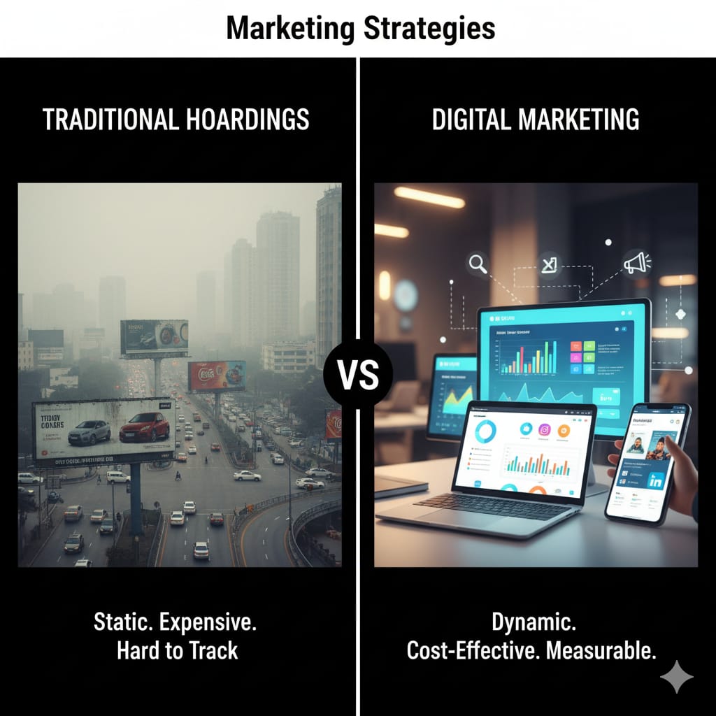 Traditional Hoardings vs. Digital Marketing: Which Wins for Your Business? 🛣️ Hoardings: Static, expensive, and hard to track. Best for localized brand awareness for businesses like real estate, local events, or hyper-local retail. Think high-vis