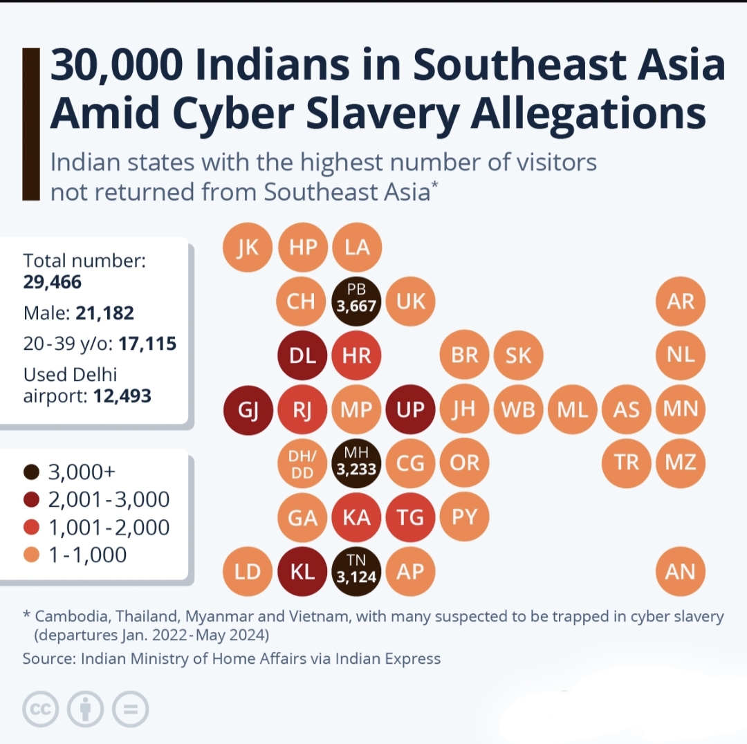 Alarming numbers: Nearly 30,000 Indians trapped in cyber slavery across Southeast Asia. A stark reminder of the growing human trafficking crisis, especially in countries like Cambodia, Thailand, Myanmar, and Vietnam."
