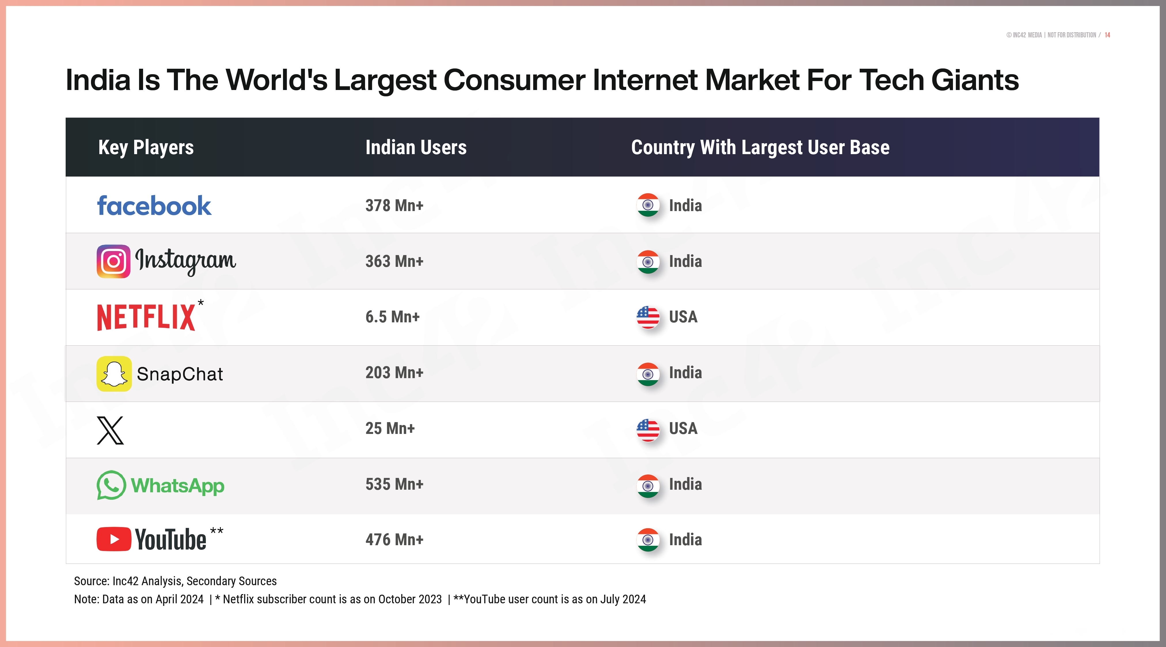 India leads as the largest user base for major tech platforms like Facebook, Instagram, WhatsApp, and YouTube, solidifying its position as the world's biggest consumer internet market. 🤯