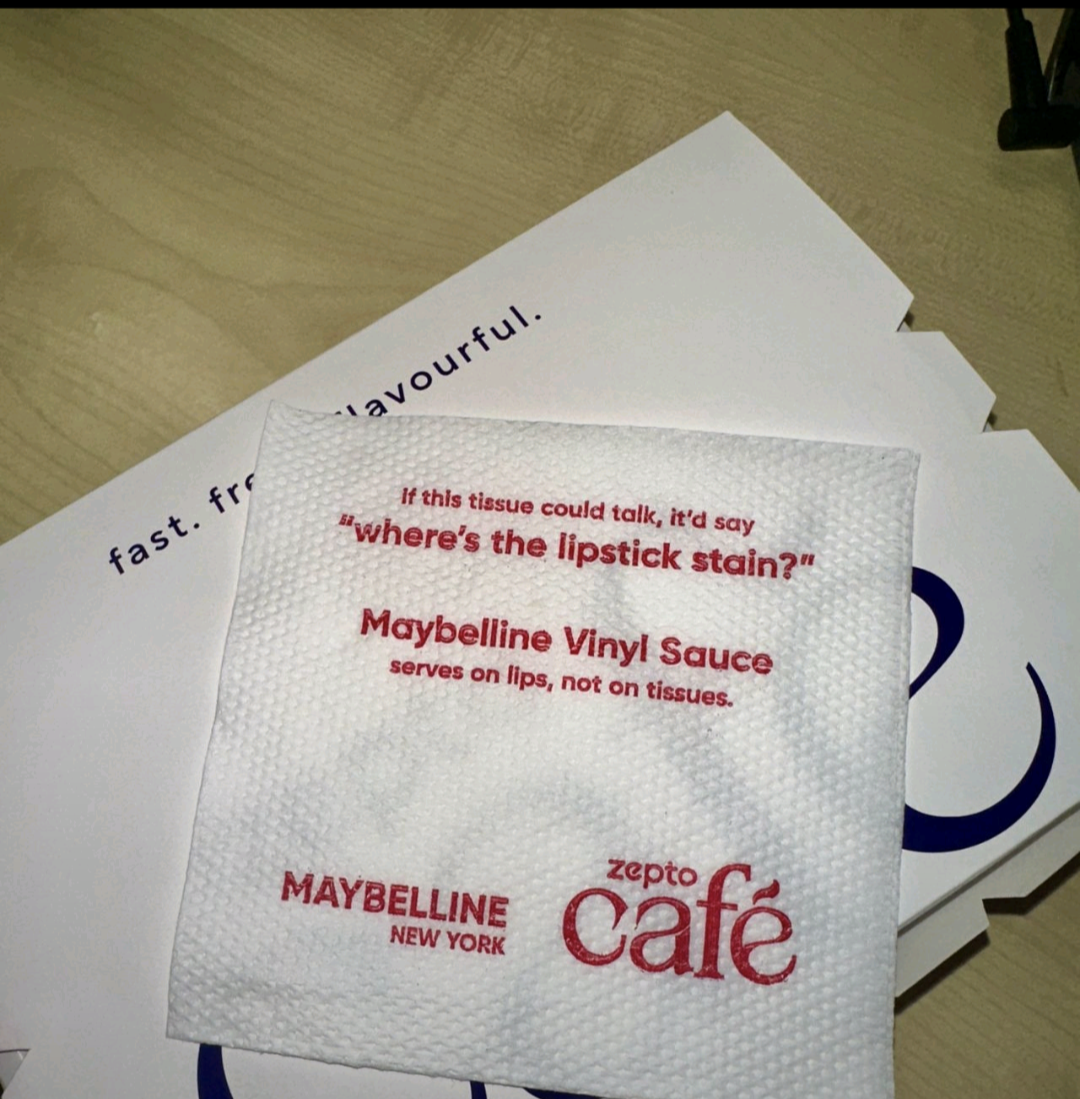 ๐ง๐ต๐ฒ ๐ฝ๐ฒ๐ฟ๐ณ๐ฒ๐ฐ๐ ๐๐ฎ๐ ๐ผ๐ณ ๐ฏ๐ฟ๐ฎ๐ป๐ฑ๐ถ๐ป๐ด !! This photo shows a clever co-branded marketing effort between Maybelline New York and Zepto Cafรฉ. The tissue in the image features a witty message: "If this tissue could talk, itโd say 'whereโ