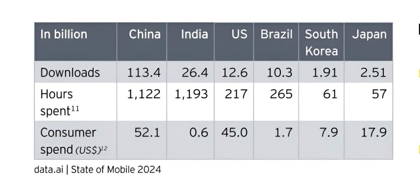 โญIndia ๐ฎ๐ณ has become became the leader in terms of time spent on mobile apps, overtaking China ๐จ๐ณ. โญ In terms of revenue, however, India continues to lag compared to many smaller markets and did not feature in the top 20 revenue generating marke