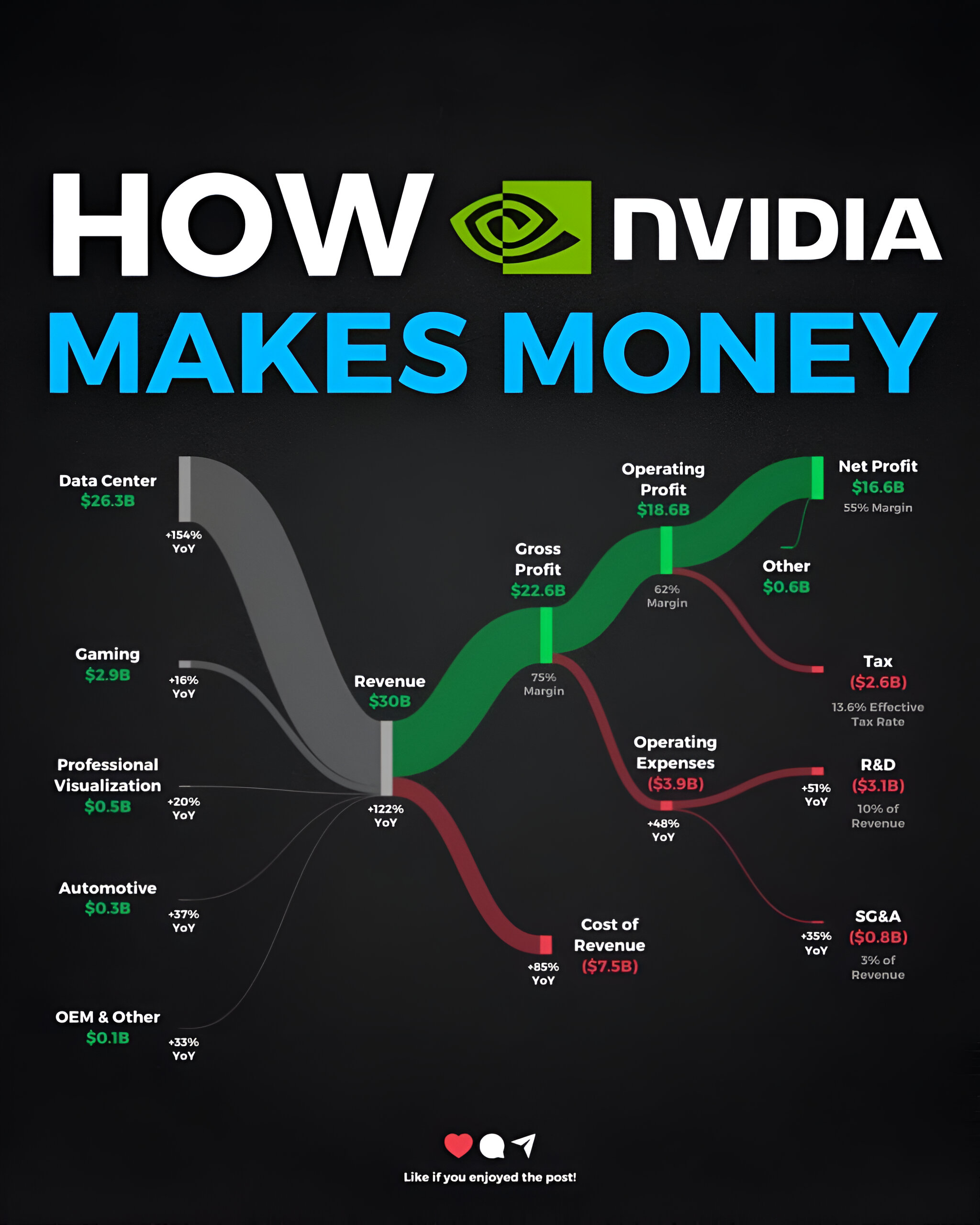 The image summarizes NVIDIA's revenue breakdown, showing $30B in total revenue, with significant contributions from Data Center ($26.3B) and Gaming ($2.9B), alongside impressive profit margins. 🔥🔥🔥