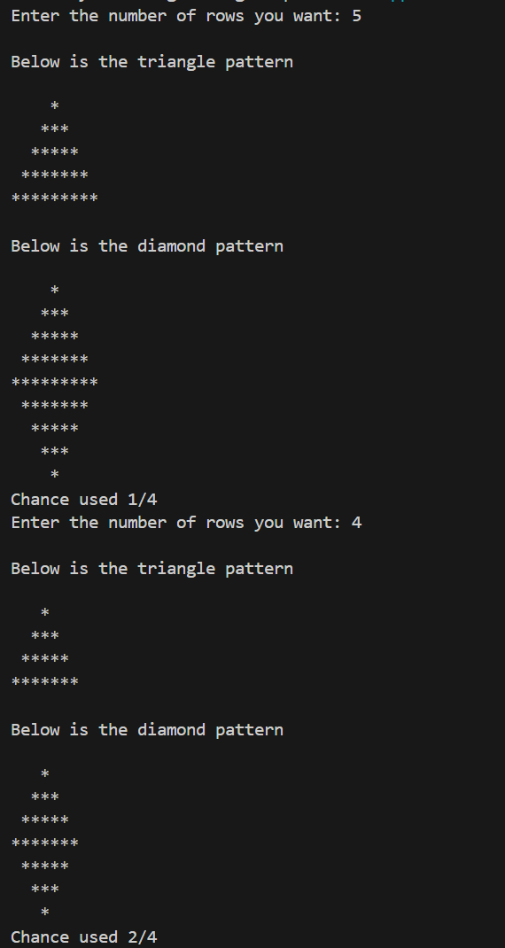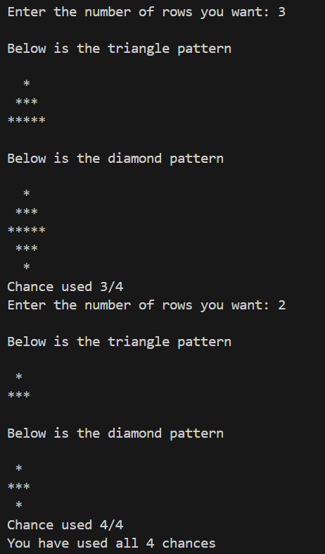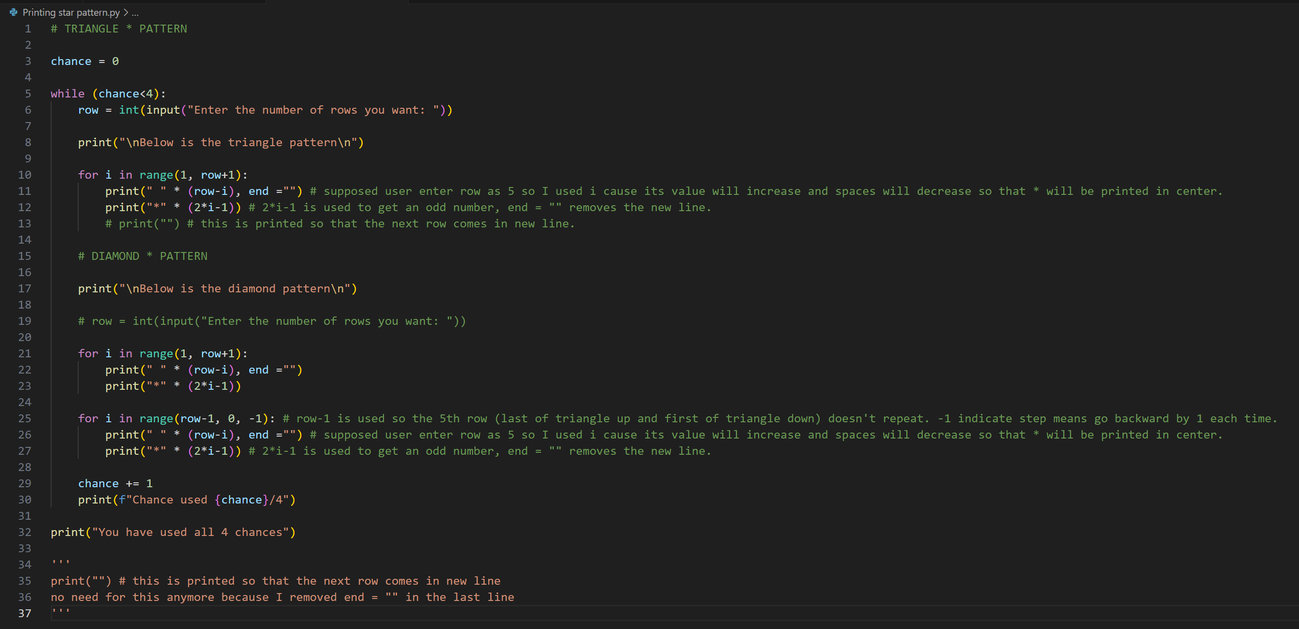 Day 4 of learning python as a beginner. Topic: printing * pattern using while and for loop. I took the famous challenge of printing a * (star) pattern my goal was to print a triangle and diamond shape pattern. first I used int(input()) function to