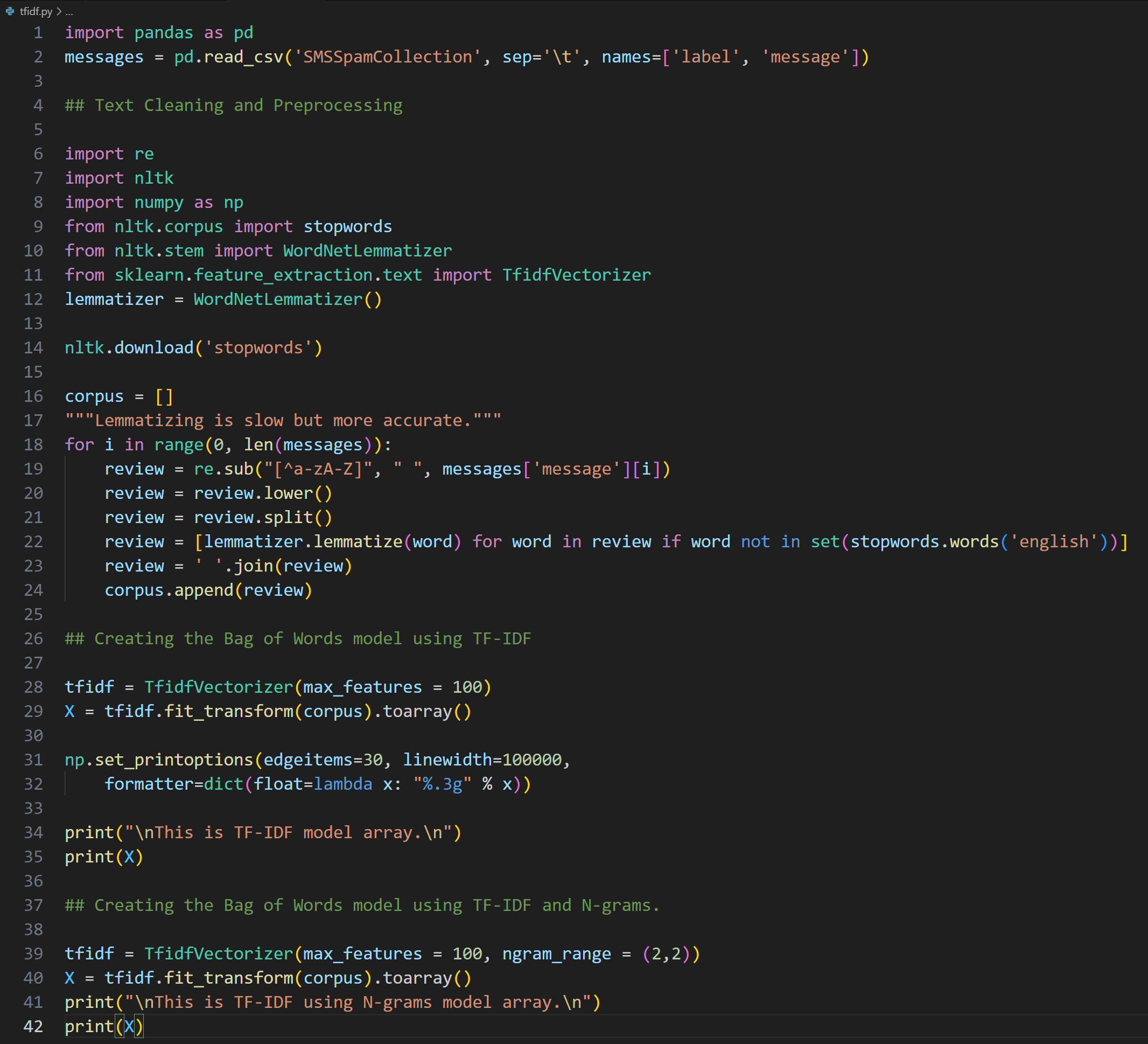 Day 12 of learning AI/ML as a beginner. Topic: TF-IDF practical. Yesterday I shared my theory notes and today I have done the practical of TF-IDF. For the practical I reused my spam classifier code and for TF-IDF I first imported it from the sklear