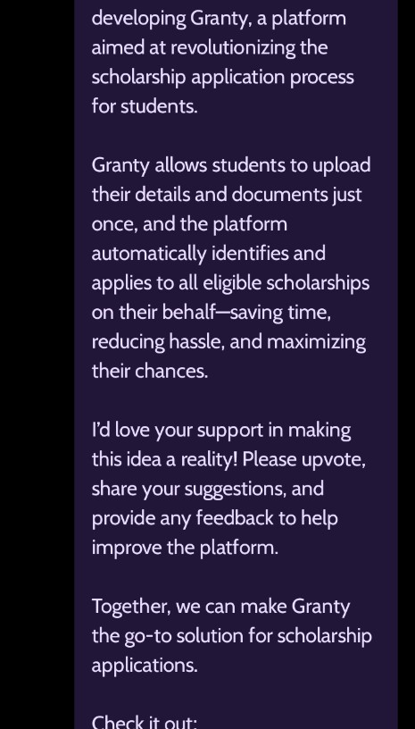 Granty just hit 100 upvotes on Medial! 🚀 A huge thank you to everyone who's supported this idea to simplify scholarship applications for students. Let’s keep this momentum going! 🙌 if you haven't checked it : https://medial.app/idea/granty-54a197c