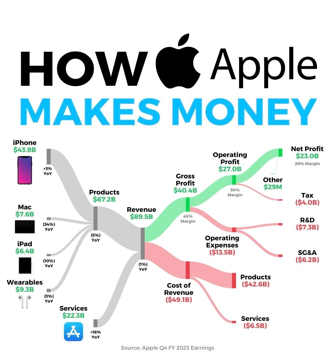 Apple's Q4 FY 2023 earnings breakdown, showing how the company generates revenue from products like the iPhone, Mac, iPad, wearables, and services, along with profit distribution after expenses such as R&D, taxes, and operating costs. 🔥