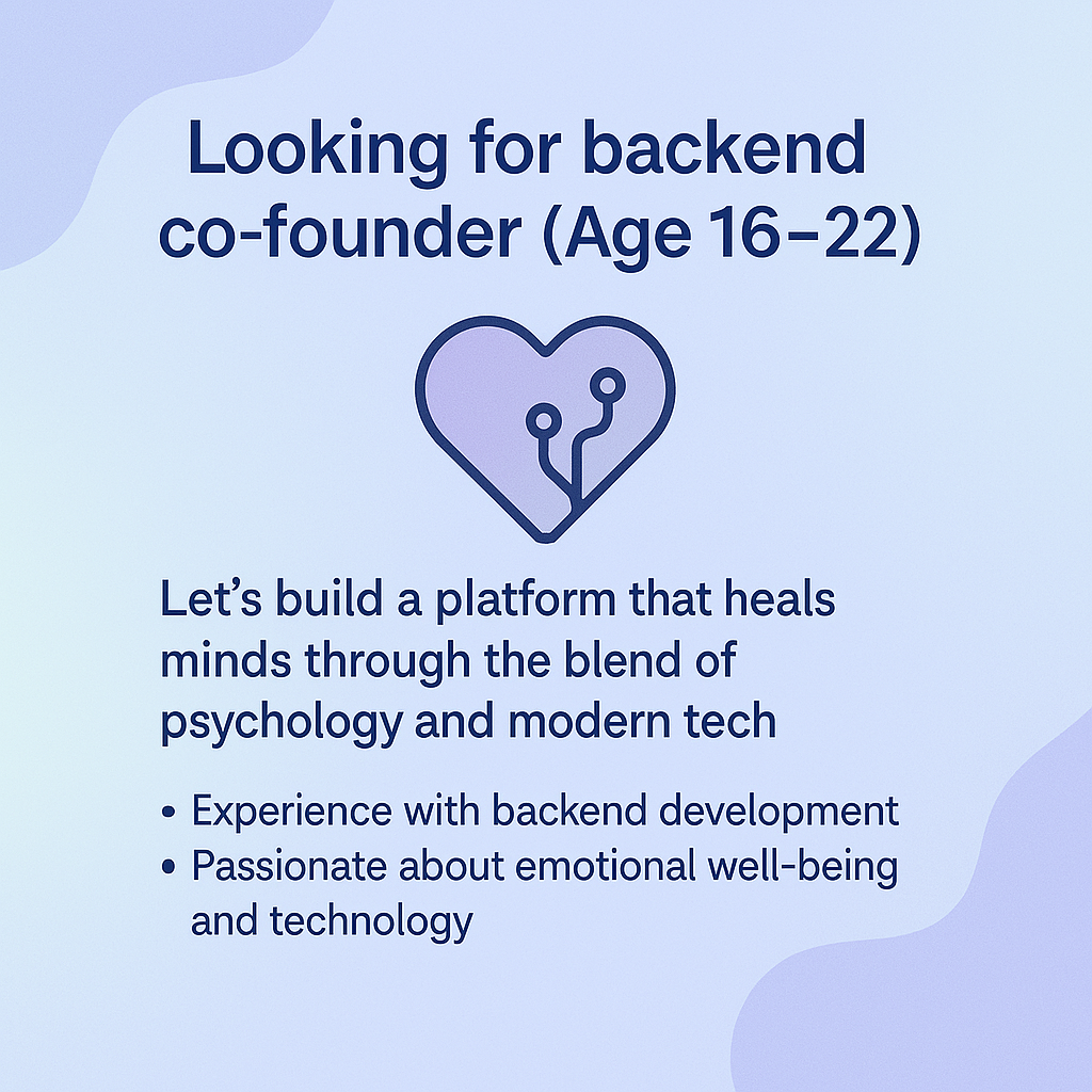 🚀 Looking for a Co-Founder (Backend Developer, Age 16–22) Hey everyone! I'm building a mental health-tech startup focused on combining psychology and technology to offer therapy access, AI-powered support, and a curated wellness store — all in one