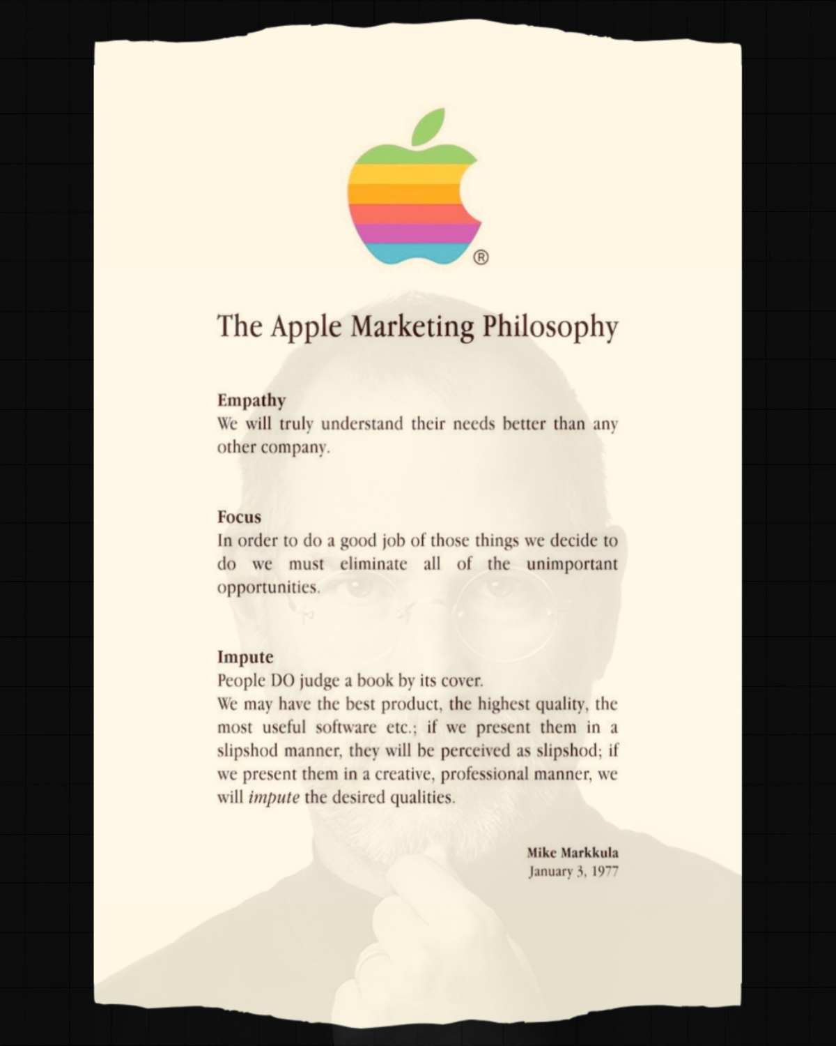 Empathy. Focus. Impute. The Three pillars of Apple's Marketing philosophy from 1977.