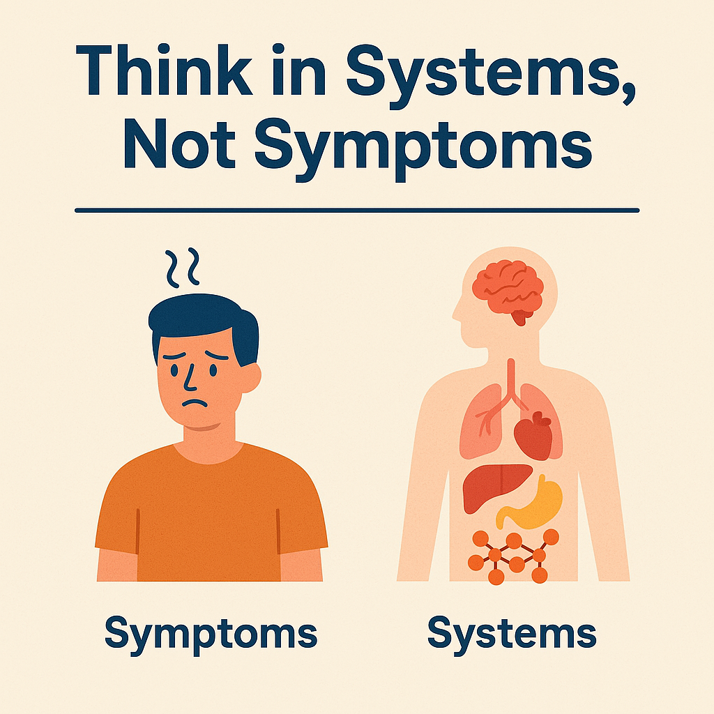 “Think in Systems, Not Symptoms” 1. The Problem With Symptom-Based Thinking Traditional medicine often works like this: Symptom → Diagnosis → Drug If tired: Rule out anaemia, hypothyroid, depression. If bloated: Rule out IBS, lactose intolerance,