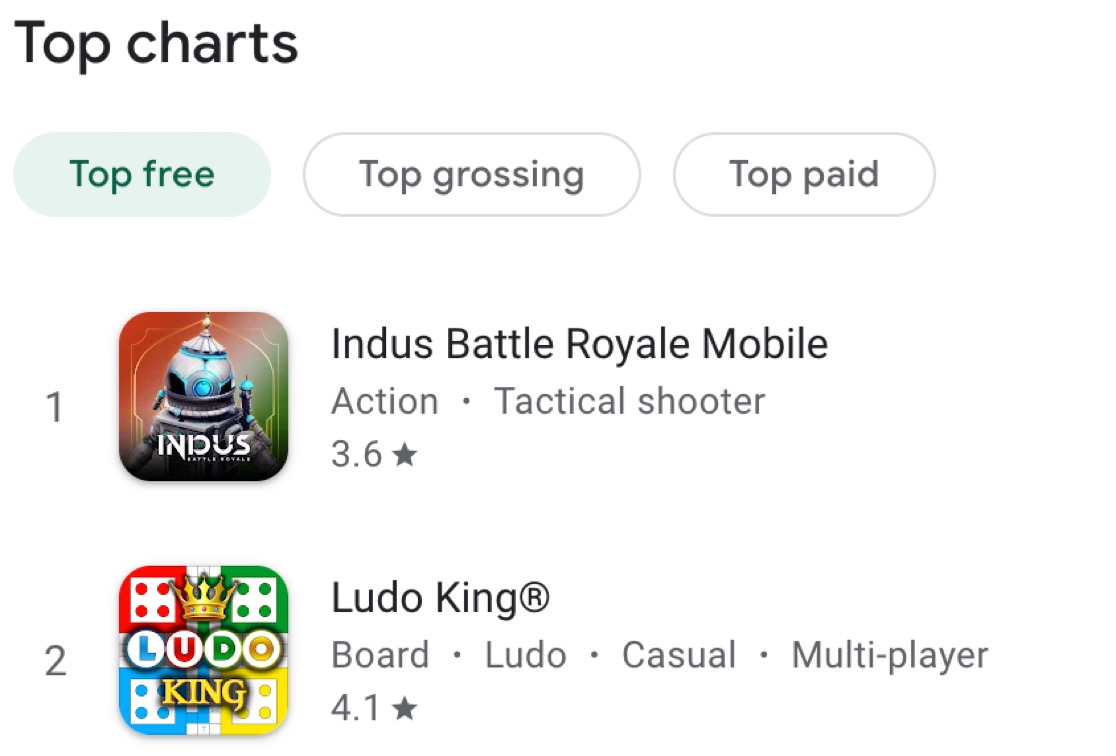 Indus Battle Royale Mobile has become No 1 game on Playstore on Day 1 of launch. Lets see how long they can sustain. Also why are people so obsessed with Ludo ๐คฃ๐คฃ