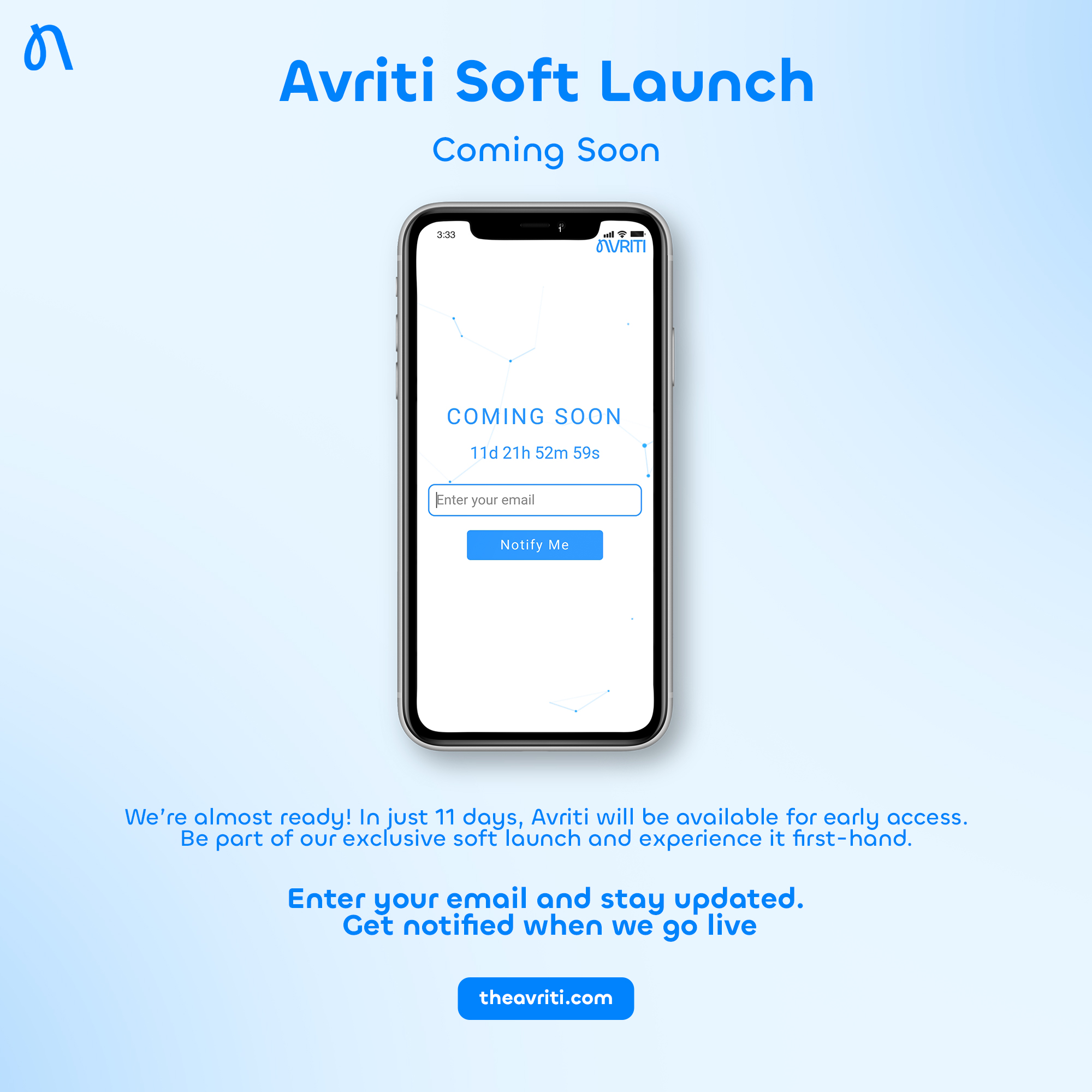 Avriti Soft Launch in just 11 days! Enter your email to get early access and be the first to experience it. visit: www.theavriti.com