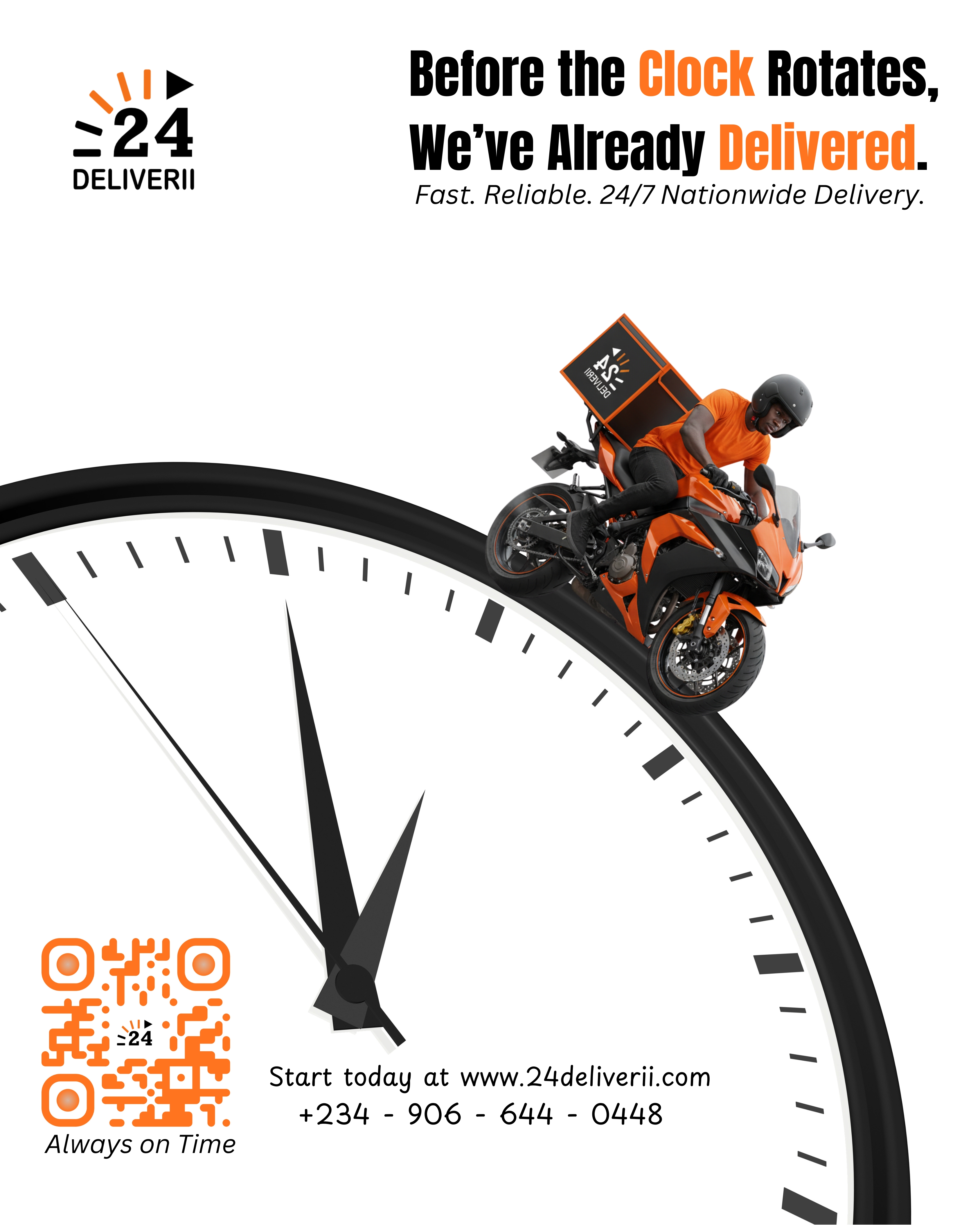 At 24deliverii, we donโt wait for time, we beat it. Our mission is simple: deliver your package before the clock rotates. Fast, reliable, and safe delivery, 24 hours a day, 7 days a week. Start today at 24deliverii.com Chat us : wa.me/+2349066440448