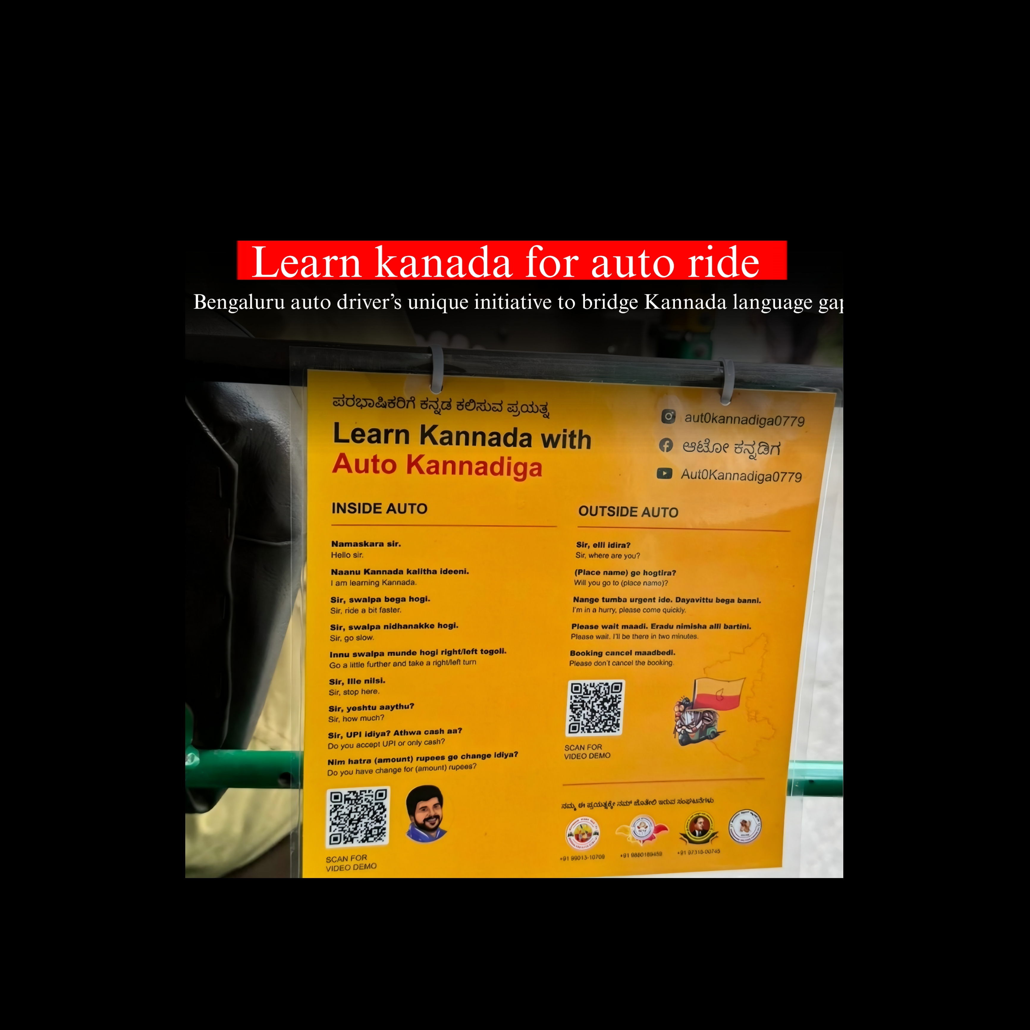 In a thoughtful move, the driver displayed a leaflet inside his auto, offering passengers a chance to learn Kannada while traveling. The leaflet, titled “Learn Kannada With Auto Kannadiga,” features common sentences in Kannada translated into English, aimed at helping non-Kannada speakers communicate better in the local language.