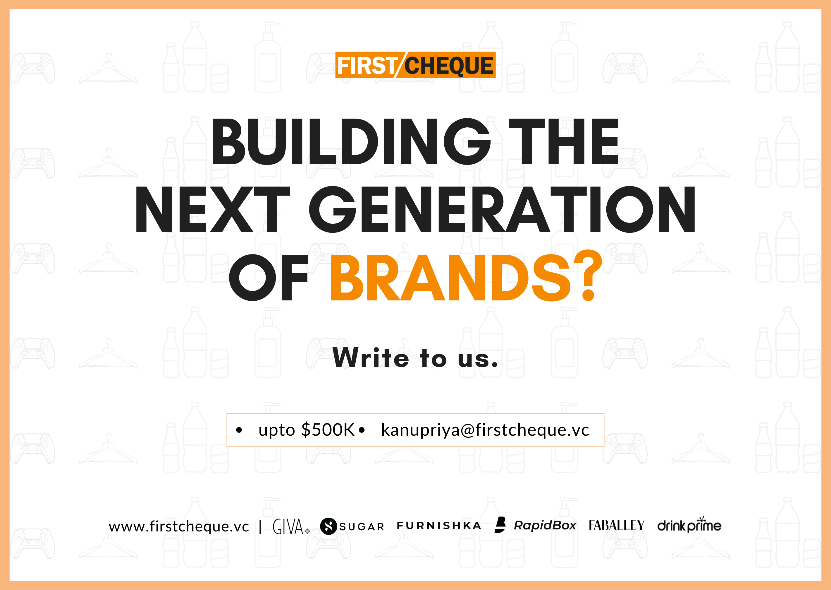 Building a game-changing brand? We would love to hear from you! We have been investing in brands since 2013, before “D2C” was even a theme. We were the first guys to back Sugar, Giva, Rapidbox as they essentially created new categories. Now, we are excited to support the next generation of brands building for Gen Z, Tier 2 / 3, farmers, kids, B2B, and everything in between! We are looking to invest upto $500K in 20 amazing brands over the next 18 months. If you are a passionate founder creating something extraordinary, drop your pitch at kanupriya@firstcheque.vc.