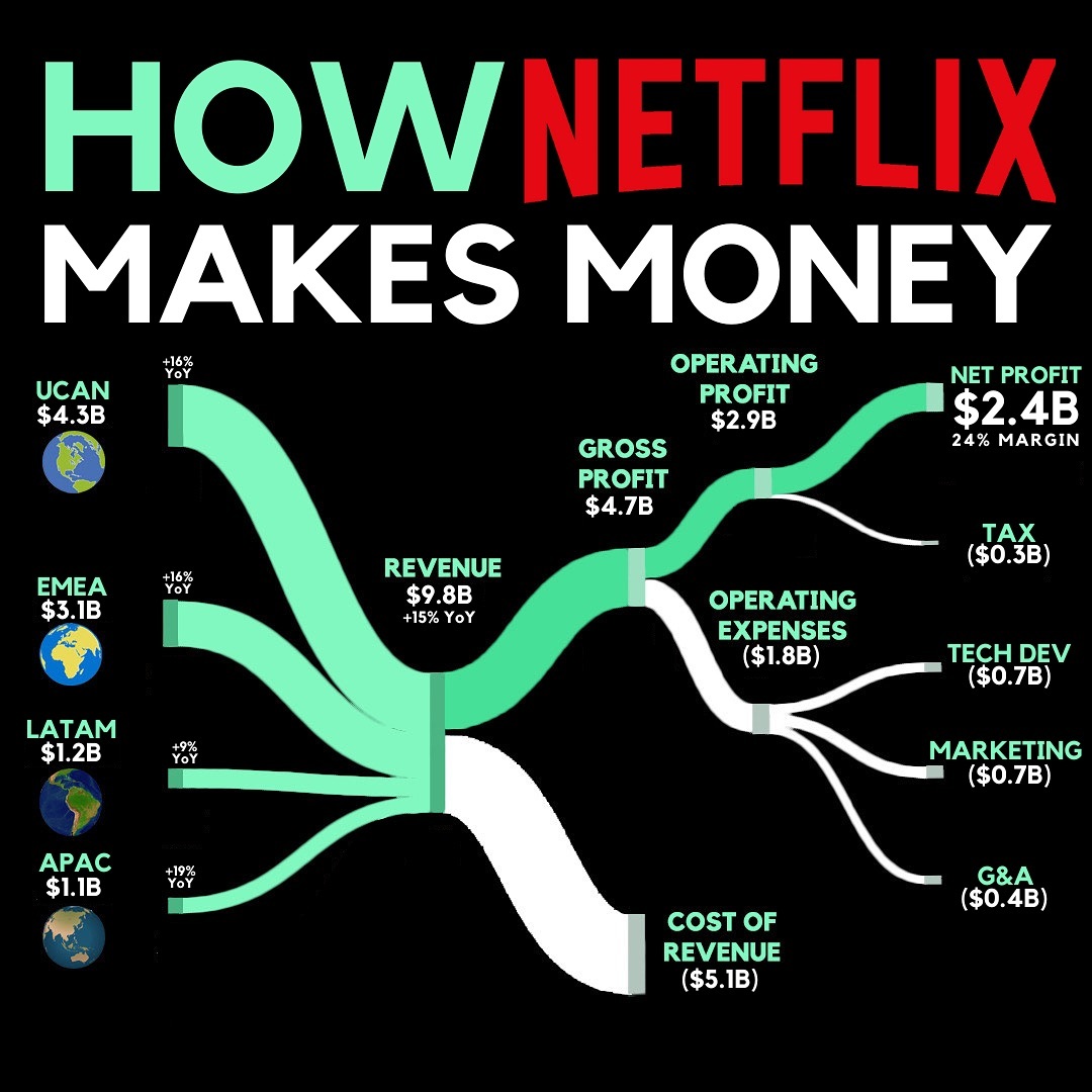 How "NETFLIX" makes money 💲 ▫️UCAN (United States & Canada): $4.3B ▫️EMEA (Europe, Middle East, Africa): $3.1B ▫️LATAM (Latin America): $1.2B ▫️APAC (Asia-Pacific): $1.1B