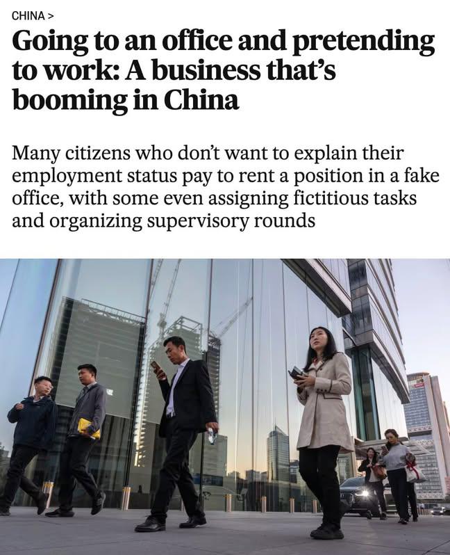 China’s Gen Z Pays for Fake Jobs to Beat Boredom: Young Chinese are spending up to $7 a day to work in staged offices with mock tasks and fake colleagues. Why? To escape the stigma of joblessness, and feel productive. Some see it as rehearsal for