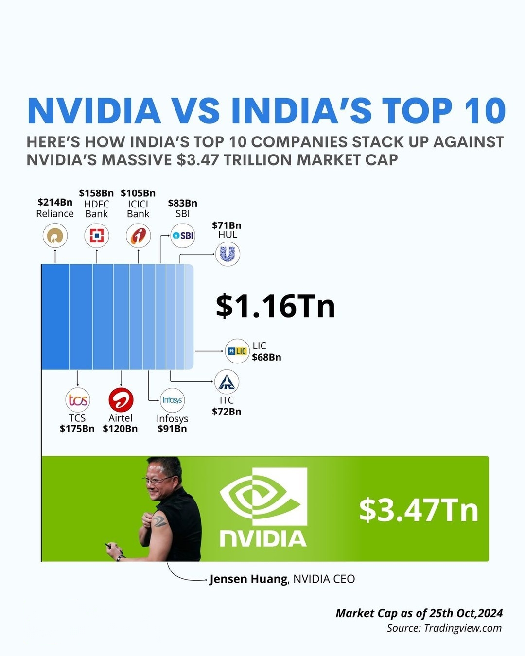 NVIDIA's market cap of $3.47 trillion surpasses the combined value of India's top 10 companies, totaling $1.16 trillion. Key companies include Reliance, HDFC Bank, TCS, Airtel, and SBI (as of 25th Oct, 2024). 📈 🔥
