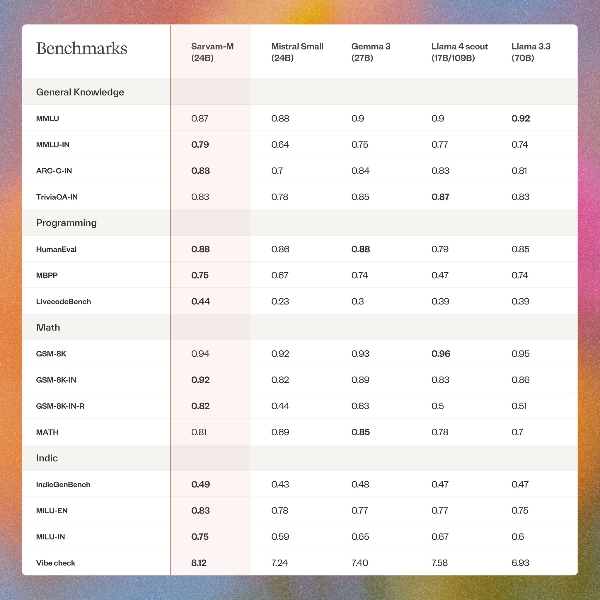 Indian AI launch: Sarvam-M, a 24B open-weights hybrid model built on top of Mistral Small. Sarvam-M achieves a new benchmark across a range of Indian languages, math, and programming tasks, for a model of its size. Here is a detailed technical blog