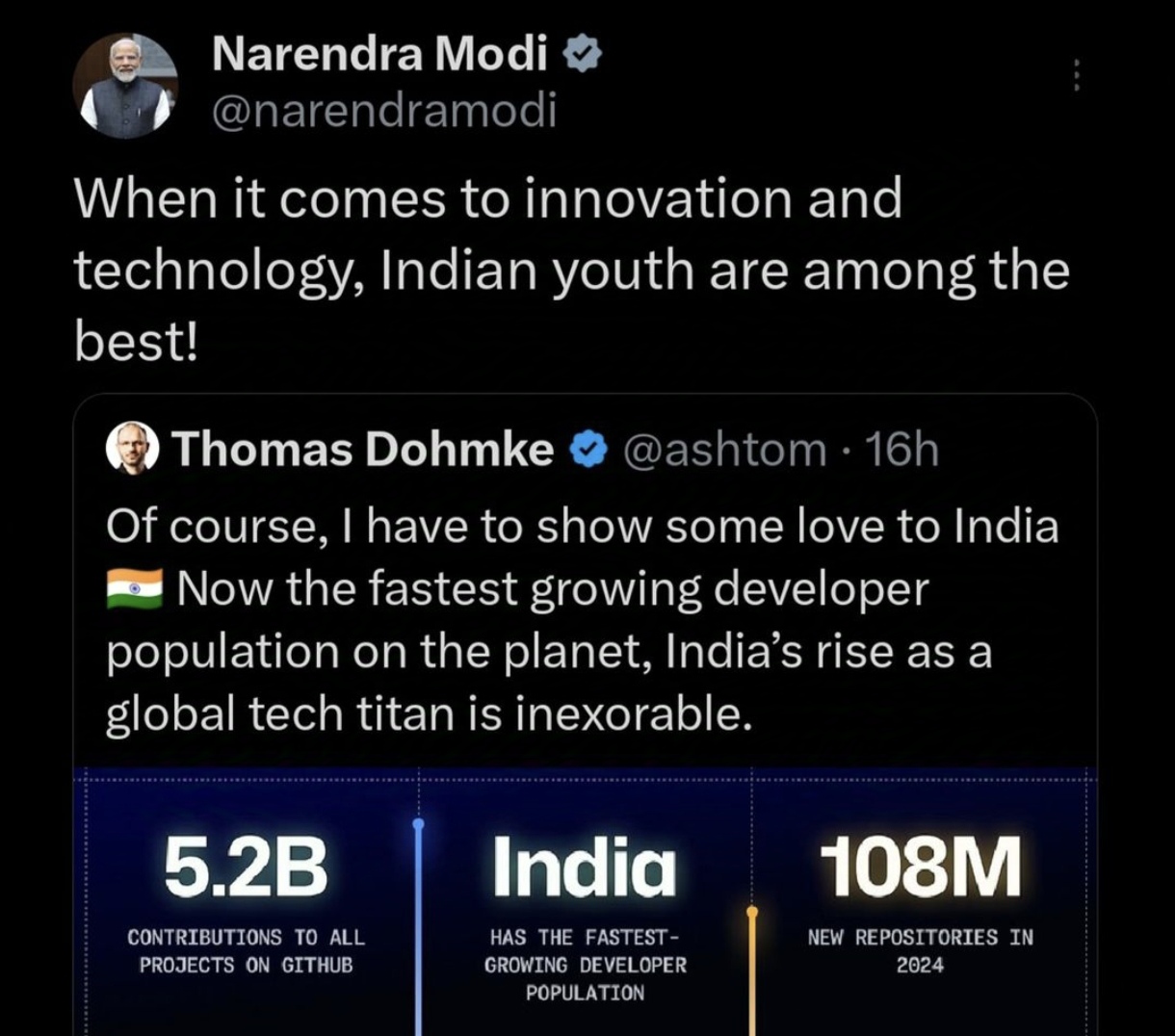 Get hub Ceo — 🇮🇳 India is fastest growing developer population on this planet Modi ji — Yes india youth is best when it comes to innovation and technology 🤣 Why every day every company Ceo try to make modi ji happy ?