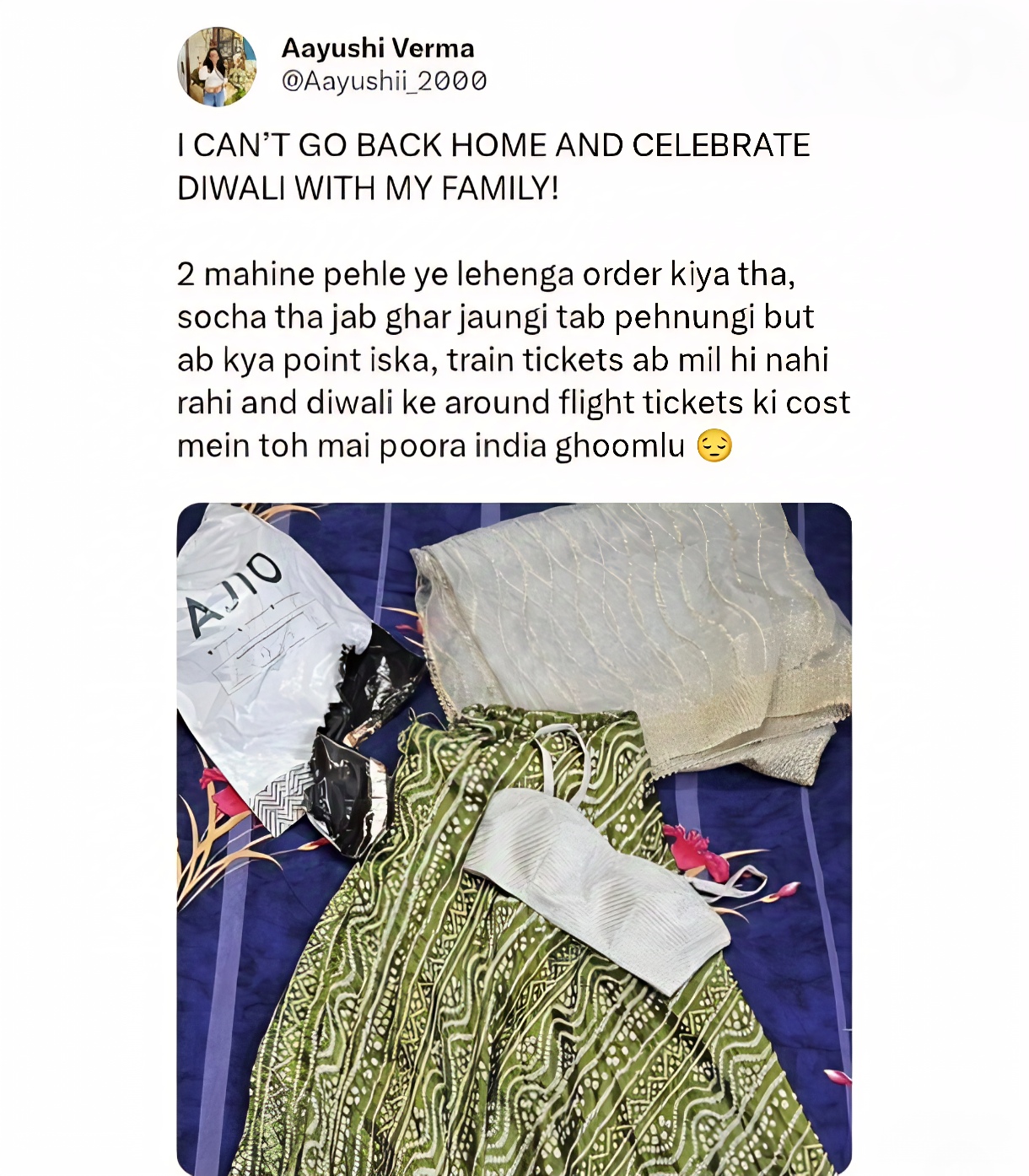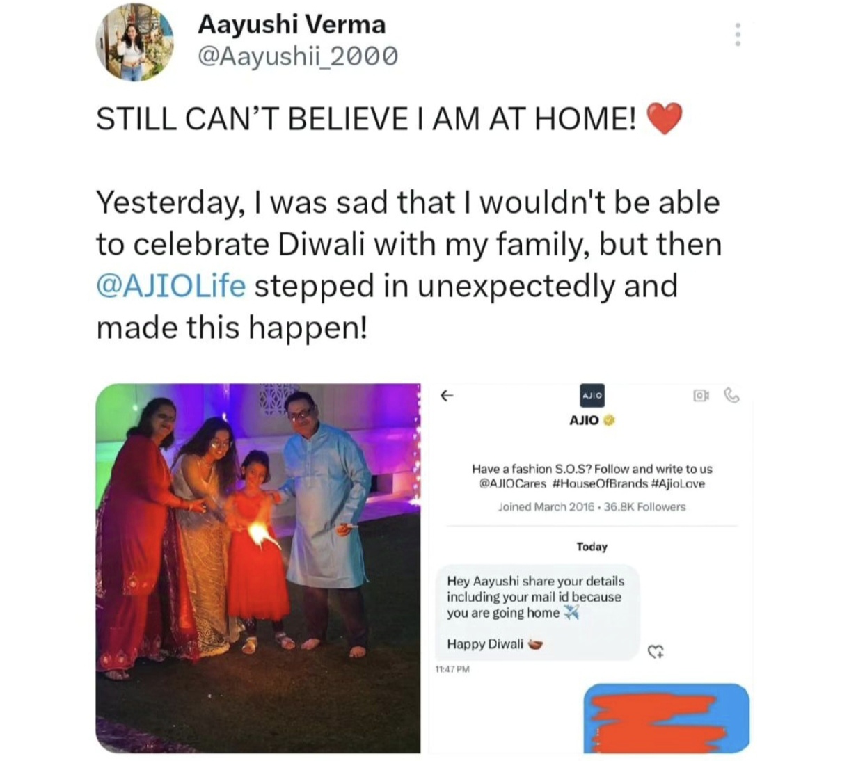 😂 AJIO Literally organized a ✈️ flight ticket for a girl who was struggling to go home for 🪔 Diwali celebration and now people's are praising Ajio on social media for kind hearted gesture.