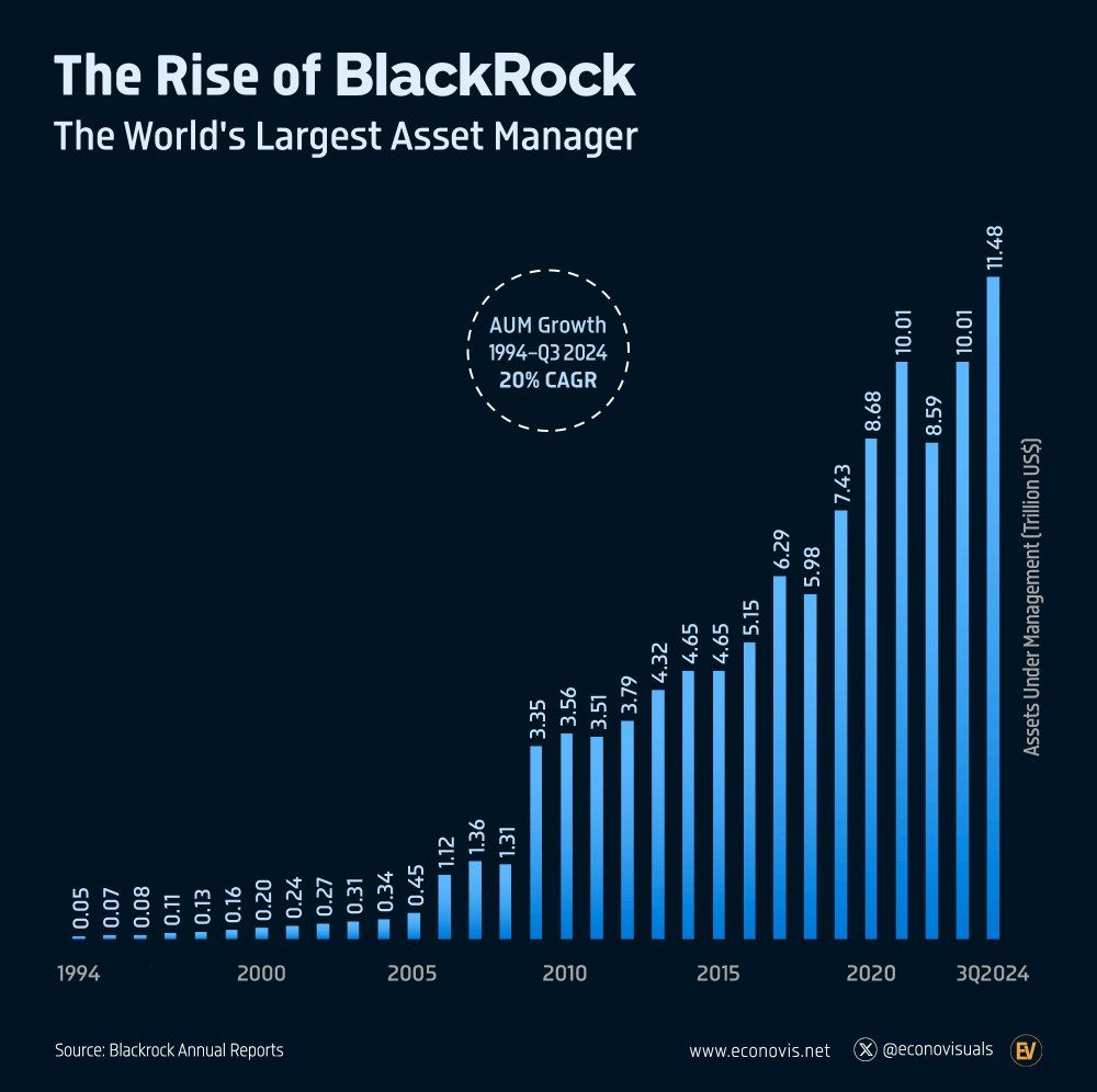BLACKROCK'S RISE 1988: BlackRock was founded with a simple but powerful aim: to offer institutional clients asset management with a focus on advanced risk management. 1994: Within just six years, BlackRock had $53 billion in AUM. 1999: The company went public, expanding its offerings and positioned itself as a key player in the asset management industry. 2006: Here came the game changing move: BlackRock acquired Merrill Lynch Investment Managers (MLIM). Global reach expanded. AUM Doubled. This move made BlackRock the largest asset management firm worldwide. 2009: With the acquisition of Barclays Global Investors (BGI), BlackRock solidified its position in the ETF market, specifically due to the iShares ETF biz and evolved into a platform delivering innovative investment solutions. 2024: Today, BlackRock’s AUM stands at a massive $11,475 billion, a three decade journey with an impressive CAGR of 20% !!! FUN FACT: BlackRock holds significant stakes in major media companies, allowing it to influence narratives globally.