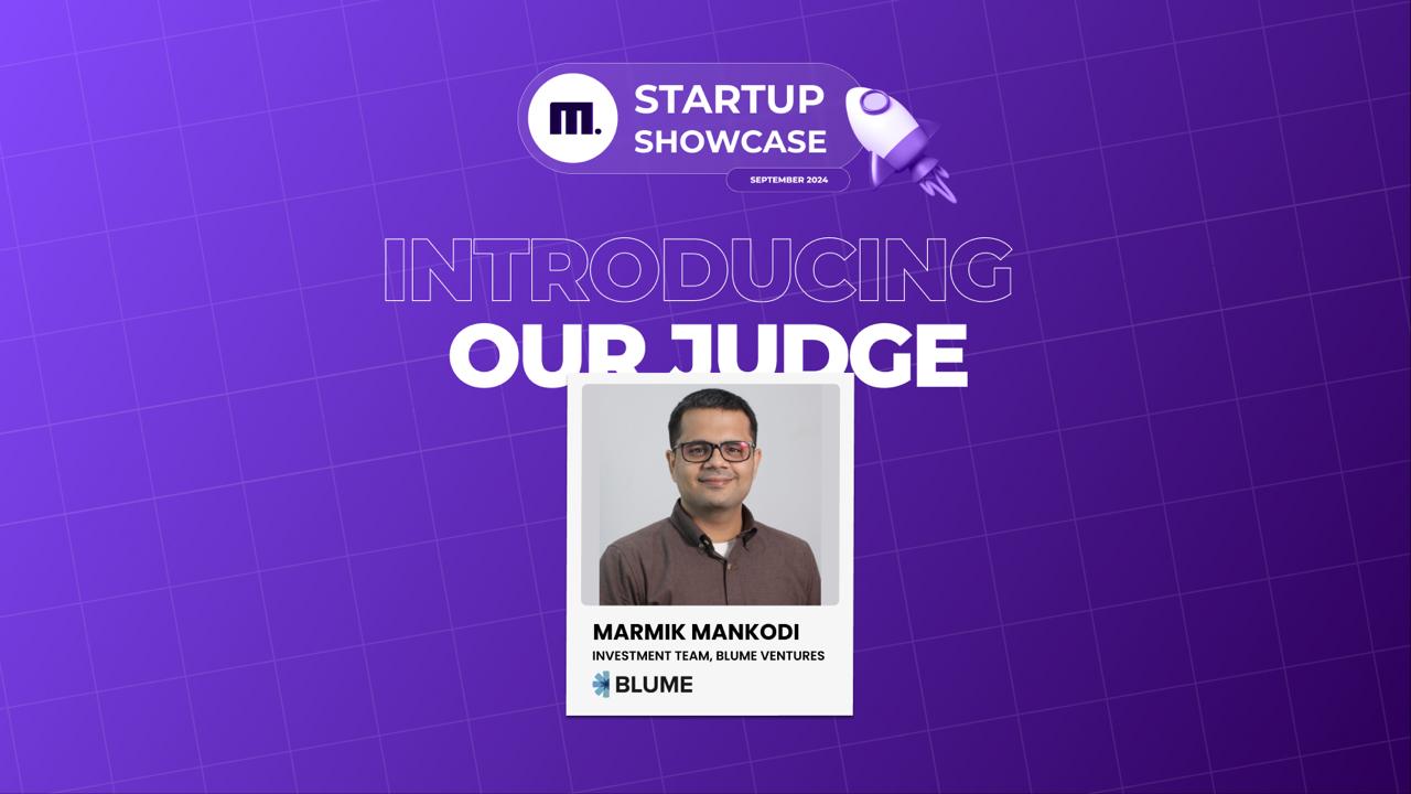 Announcing the judge for September's Startup Showcase. We have our dear friend Marmik Mankodi from Blume VC. Blume has invested in stellar startups like Unacademy, Slice, Koo, Spinny, Bhive, Dunzo, iDfy, Leverage edu, printo, webengage, Yulu and many