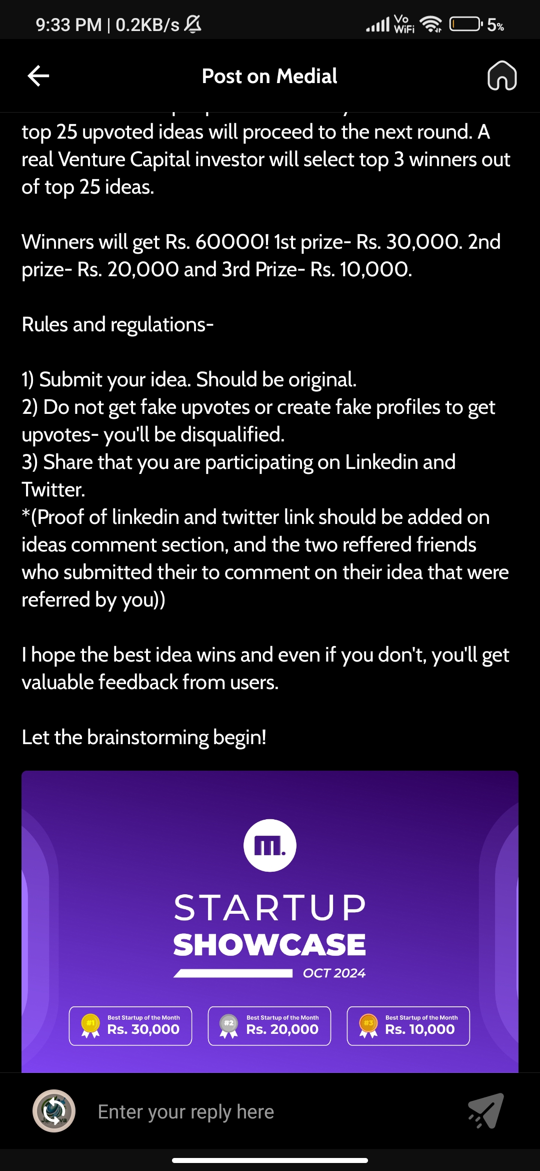 Announcement : Medial's Startup Showcase Winners for October 2024- After a month long marathon of brainstorming and seeing amazing ideas, we finally have the winners for this month's Startup Showcas selected by our judge Manik Gruver from Shastra VC. This time we considered top 50 ideas instead of top 25. Congrats to the winners. I hope you guys make it big! 1st Place- Little Move by Rahul verma 2nd Place- Mom Plants by Vishesh. 3rd Place- Scroll Sage by Akshay Prudhviraj All 250+ ideas had insane potential but as per the rules we could select only 3. This competition will happen every month and I urge you to keep refining your ideas, your pitch and keep trying again! Launching Novemberโs Startup Showcase tomorrow by 3pm! Prepare well!