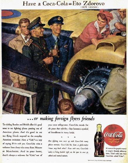 Coca-Cola Company promotional poster from the World War II era. Coca-Cola traveled the world with American soldiers, becoming a worldwide product and a symbol of American affluence.