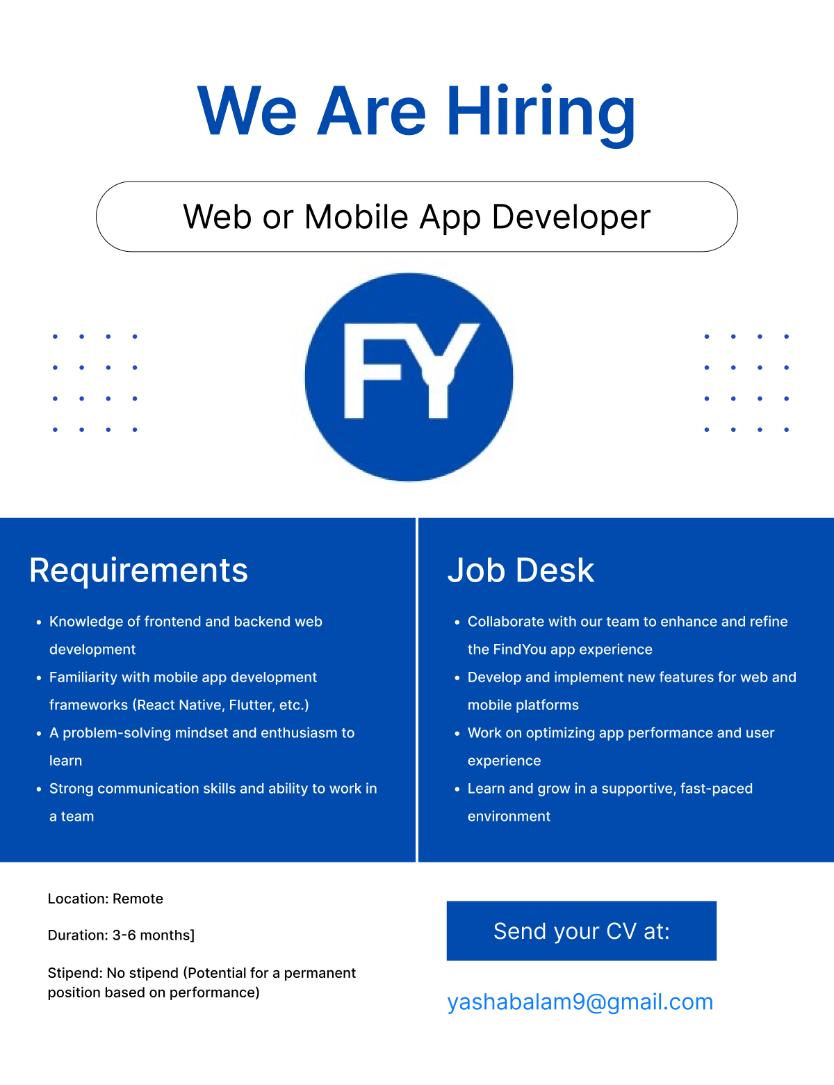 🚀 Exciting Internship Opportunity at FindYou! 🚀 Are you a passionate Web or Mobile App Developer eager to gain hands-on experience in a dynamic startup environment? At FindYou, we’re on a mission to revolutionize the way people connect with skilled professionals, from carpenters to digital experts. Position: Web & Mobile App Developer Intern Location: Remote/On-site Duration: [Insert Duration, e.g., 3-6 months] Stipend: No stipend (Potential for a permanent position based on performance) What You’ll Do: Collaborate with our team to enhance and refine the FindYou app experience Develop and implement new features for web and mobile platforms Work on optimizing app performance and user experience What We’re Looking For: Knowledge of frontend and backend web development Familiarity with mobile app development frameworks (React Native, Flutter, etc.) 📧 Interested? Email your resume to yashabalam9@gmail.com and be part of our journey to connect people with trusted professionals!