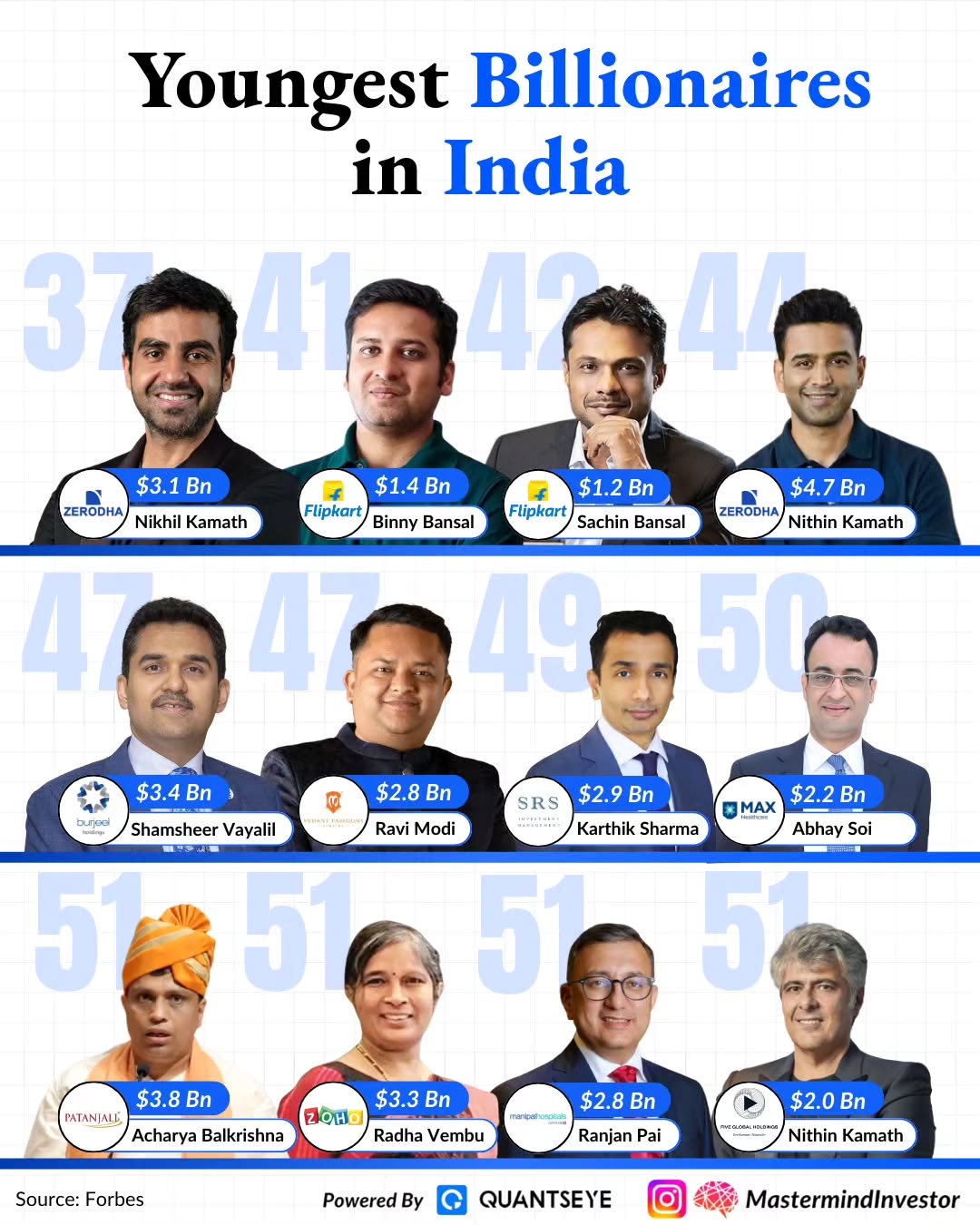 💸 Meet India’s Youngest Billionaires! 🚀 India’s entrepreneurial spirit shines through its youngest billionaires, proving age is just a number when chasing dreams. Here are the rising stars of wealth: 🎯 37 Years: 💰 Nikhil Kamath (Zerodha) - $3.