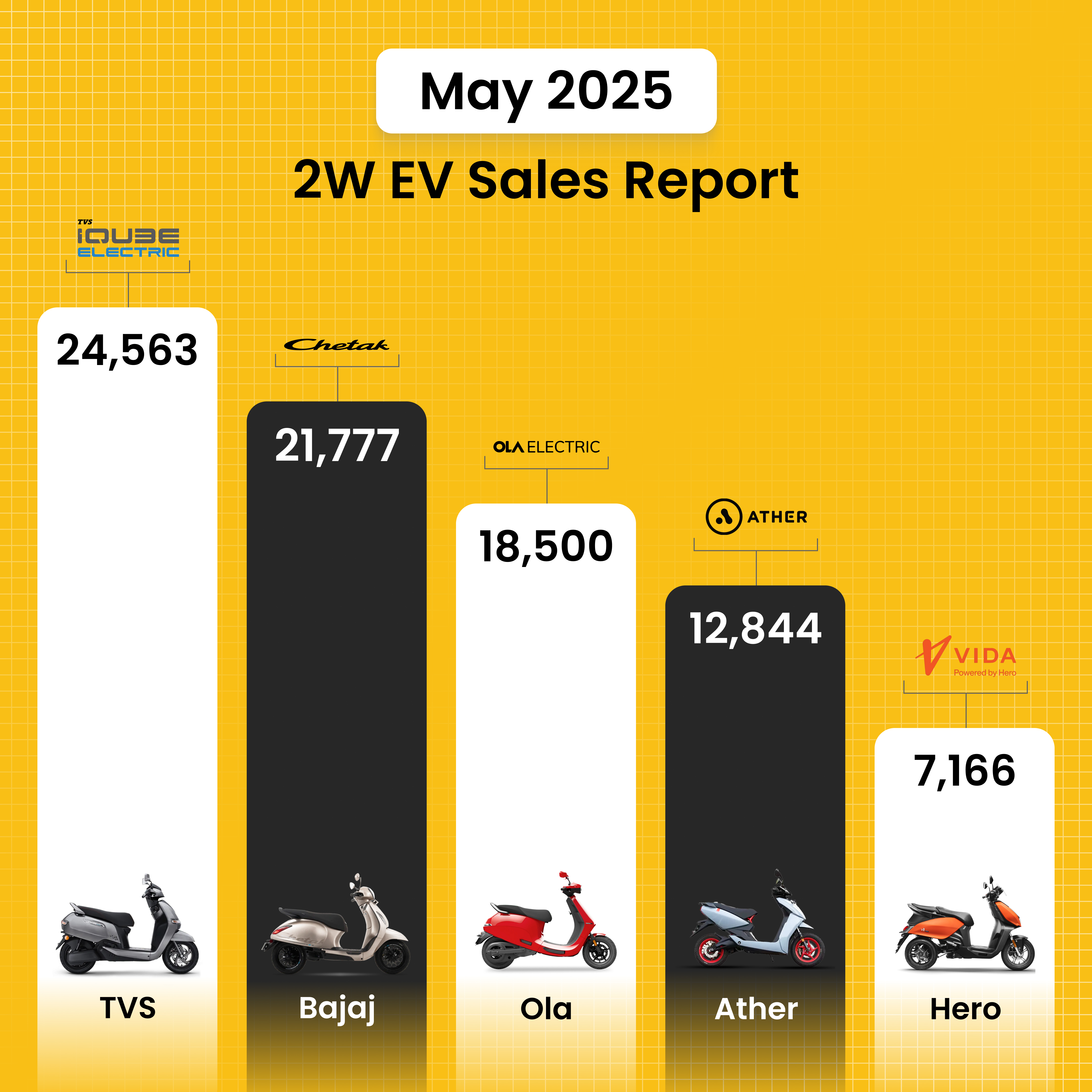 May 2025 2W EV Sales: TVS Leads, Ola Slips to 3rd Spot India’s electric scooter market saw a significant shift in May 2025. TVS Motor Company secured the top position with 24,563 units sold, while Bajaj Auto climbed to second with 21,777 units. Surp