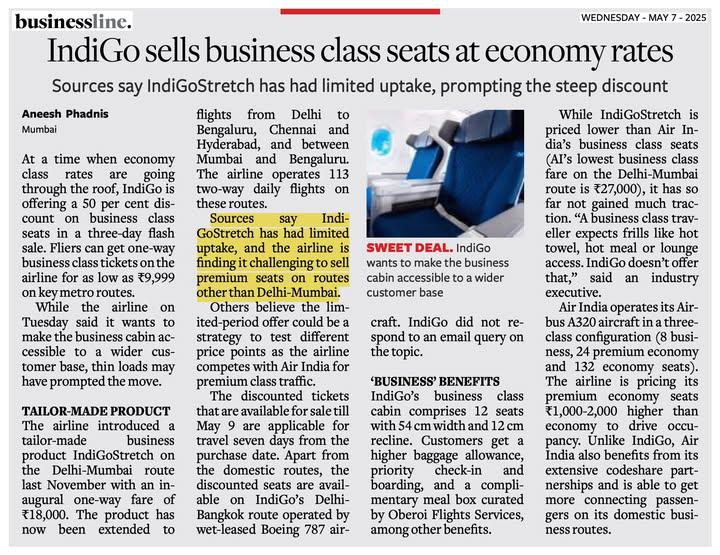 I wonder if IndiGo's well-known low-cost positioning and appeal is coming in the way of them being able to sell the very few business-class seats. A full-service airline having low-cost (compared to business-class and premium economy) seating section
